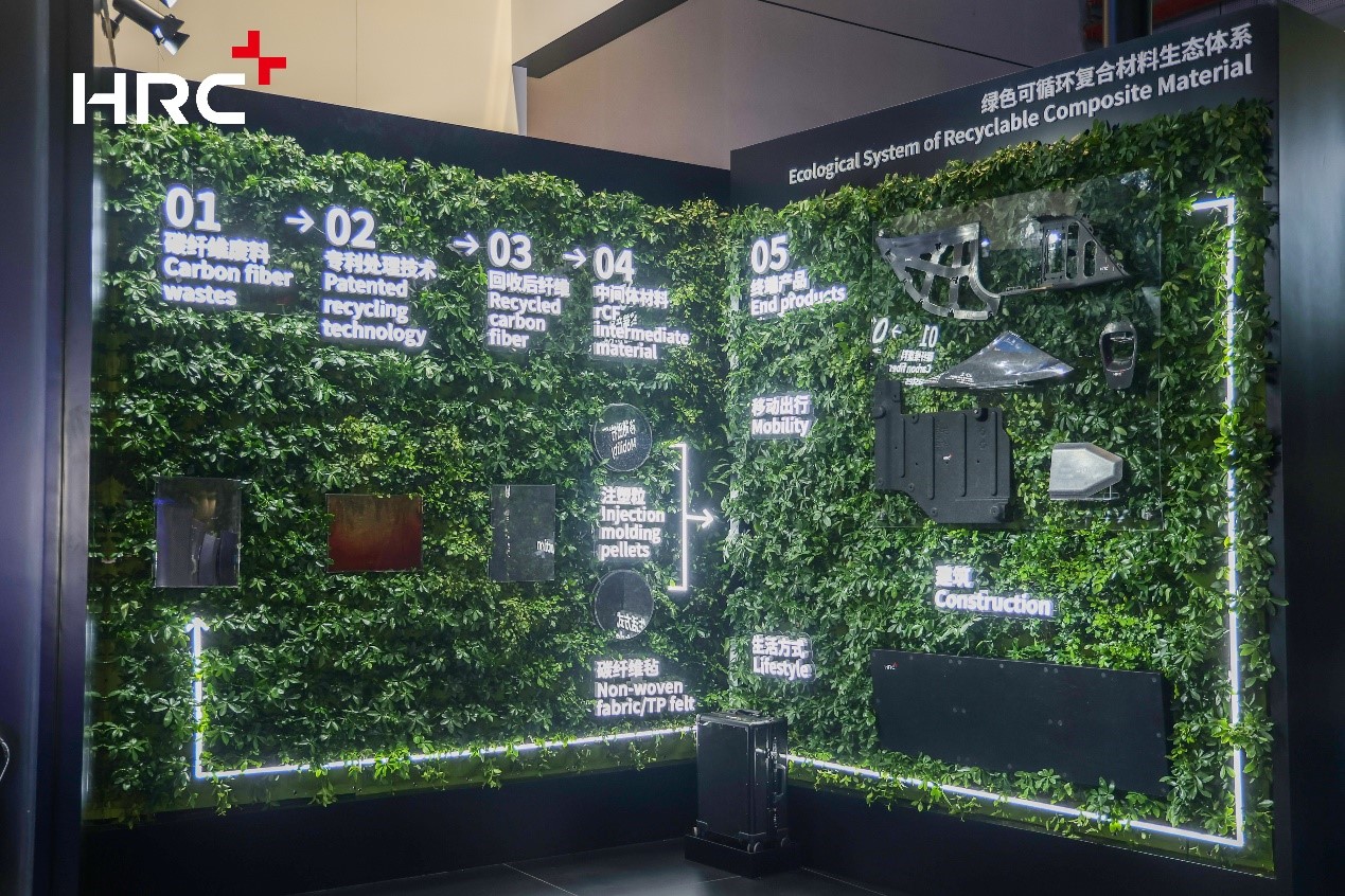 此外,HRC还重点呈现了全面升级的“绿色可循环复合材料生态体系”,以更多元的产品类型及更卓越的可持续性表现,展现了公司在碳纤维回收及再利用领域取得的重要突破。通过进一步聚焦回收专利技术,HRC以更低碳的方式实现了对碳纤维废料的有效提取,回收碳纤维在保留原生材料95%以上机械性能的同时,碳排放大幅锐减至新料的4.7%。