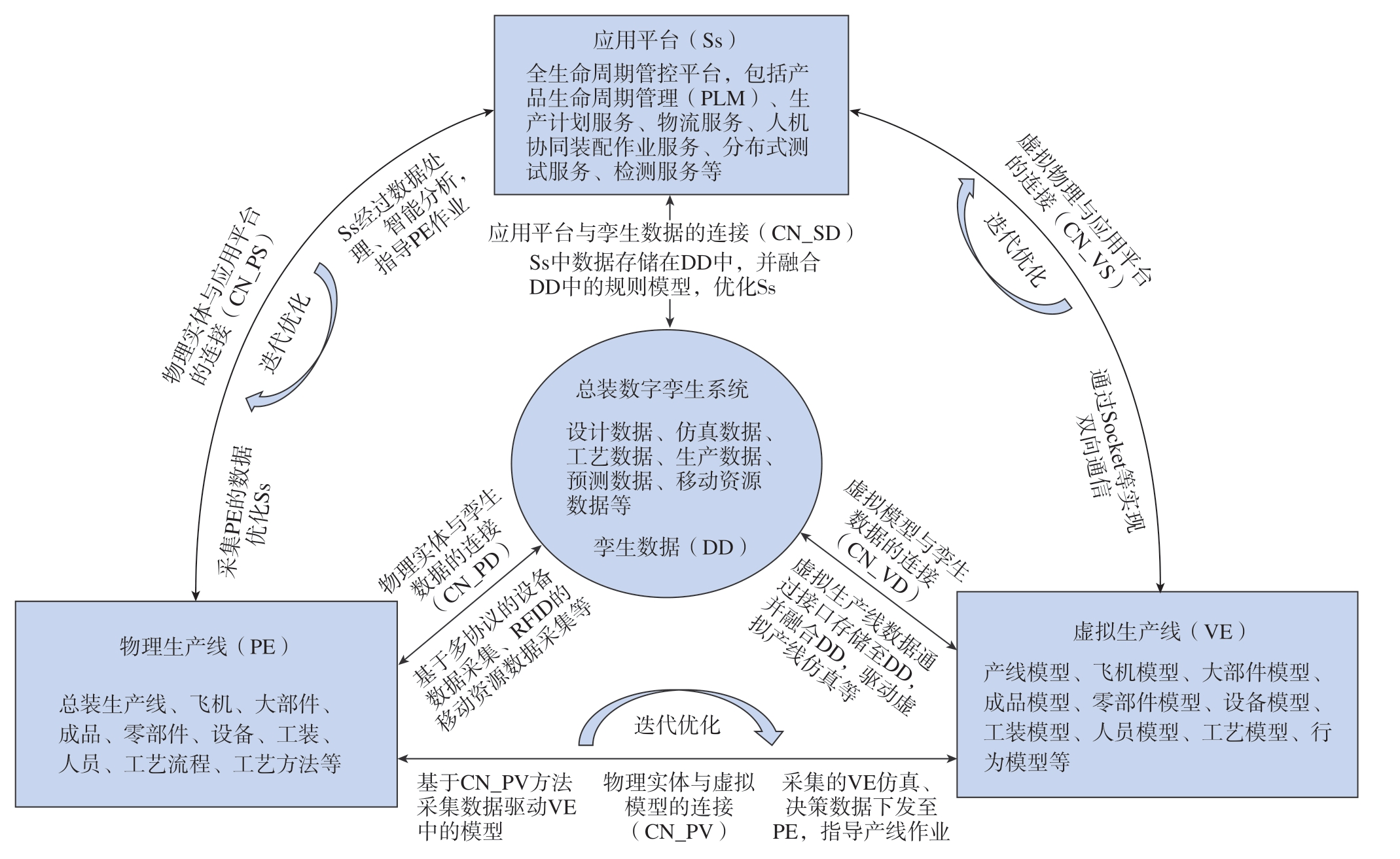 (4)总装孪生数据。主要负责为物理生产线、虚拟生产线及应用平台提供数据支撑,包括设计数据、装配仿真数据、制造过程数据、交互迭代与动态演化的孪生数据。如物理生产线上机位、飞机、工装、设备等物理生产线的数据,以及生产过程中的运行数据,通过RFID、数据采集卡、嵌入式系统、便携式终端进行数据采集;虚拟生产线中机位、飞机、工装、设备等几何、物理、行为模型;应用平台中的工艺设计、仿真、故障预测及模型、工艺管理、生产管理等数据。