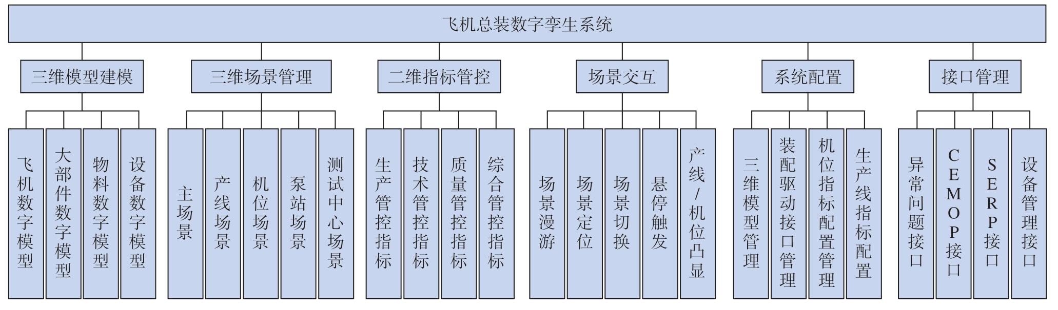 飞机总装数字孪生系统主要包含了三维模型建模、三维场景管理、二维指标管控、场景交互、系统配置、接口管控6大主要功能模块,其组成如图6所示。
