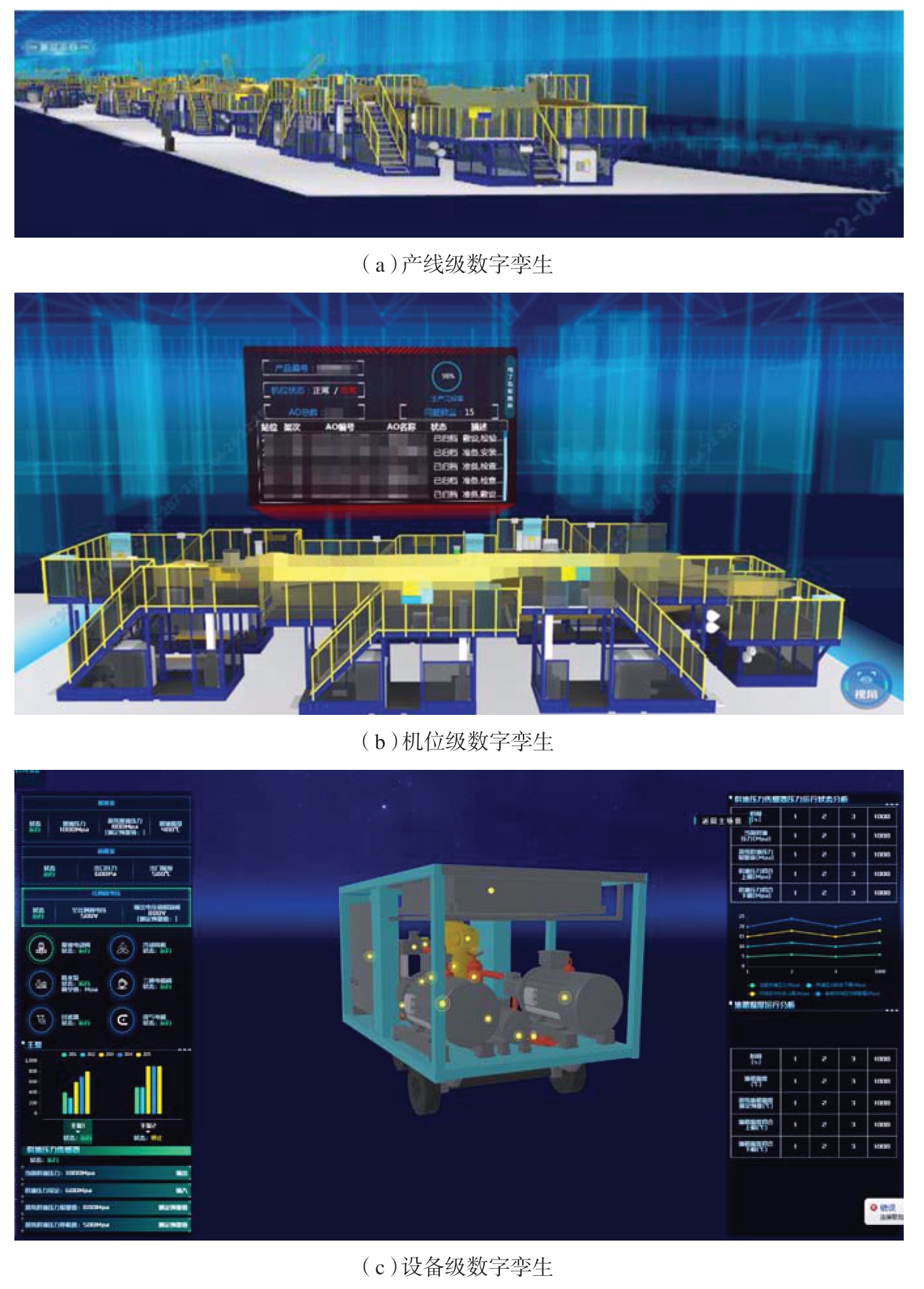 (2)设备级数字孪生主要表征设备的运行状态,由于飞机总装生产线大部分设备结构复杂、运行周期长、工作环境恶劣,设备运行时产生大量噪音、振动,并处于高温环境,人员无法实时地对设备进行查看,难以获取当前设备运行的状态及异常问题。基于历史数据及实时采集数据,建立状态监控模型及设备故障预测模型,结合设备三维模型,构建设备数字孪生模型,实现设备级数字孪生。依托设备级数字孪生实现虚实交互,表征设备的运行状态及健康状态,提高设备运行状态的透明度、可靠性和可用性。