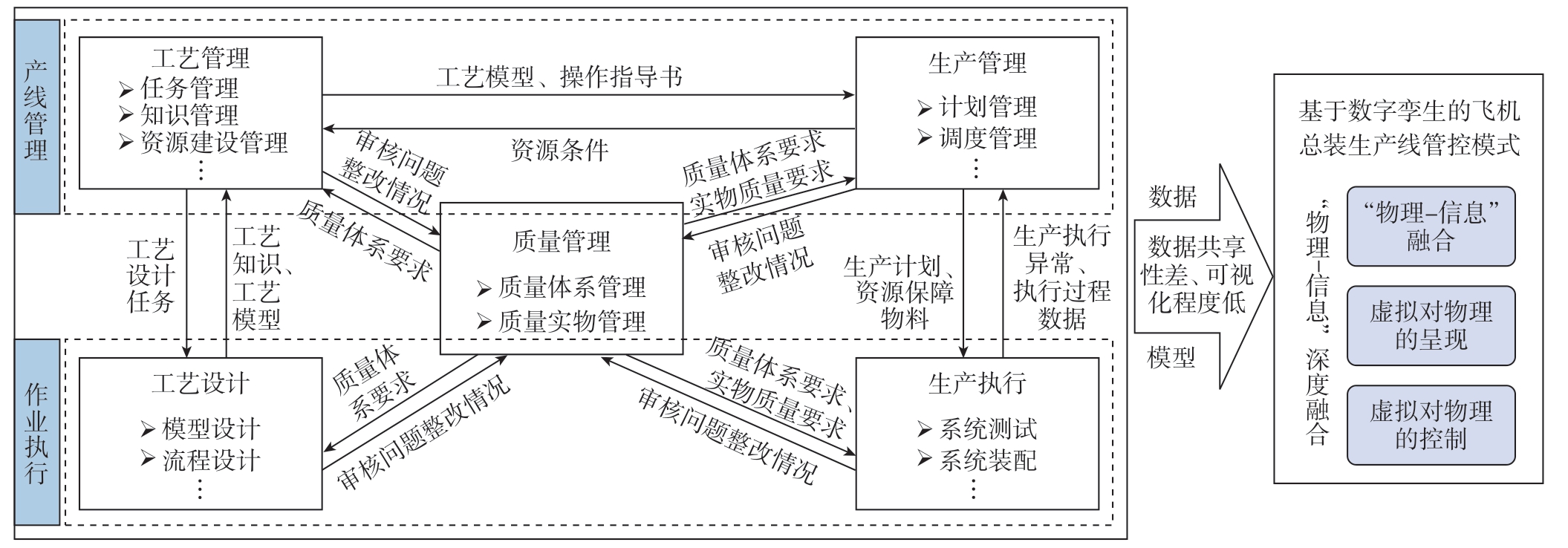 (1)在生产线运行前端,按照质量体系要求及工艺管理输入开展工艺设计,形成的工艺知识及模型纳入工艺管理系统中进行管理。同时,将审核问题的整改情况反馈至质量管理系统;生产运行时,生产管理向执行端提供生产作业计划,按照工艺要求、质量体系要求及质量实物要求开展生产作业,需实现生产线各要素的采集与存储,以保证每架飞机生产全过程可被追踪,由于系统装配和系统测试具有较大差异,作业形式与手段多样,生产线移动资源 (如人、设备、机器等)较多,数据采集存在困难;同时,采集到的数据多源异构且系统之间交互复杂,难以直观地展示生产线当前状态,增加了生产线的管控难度。