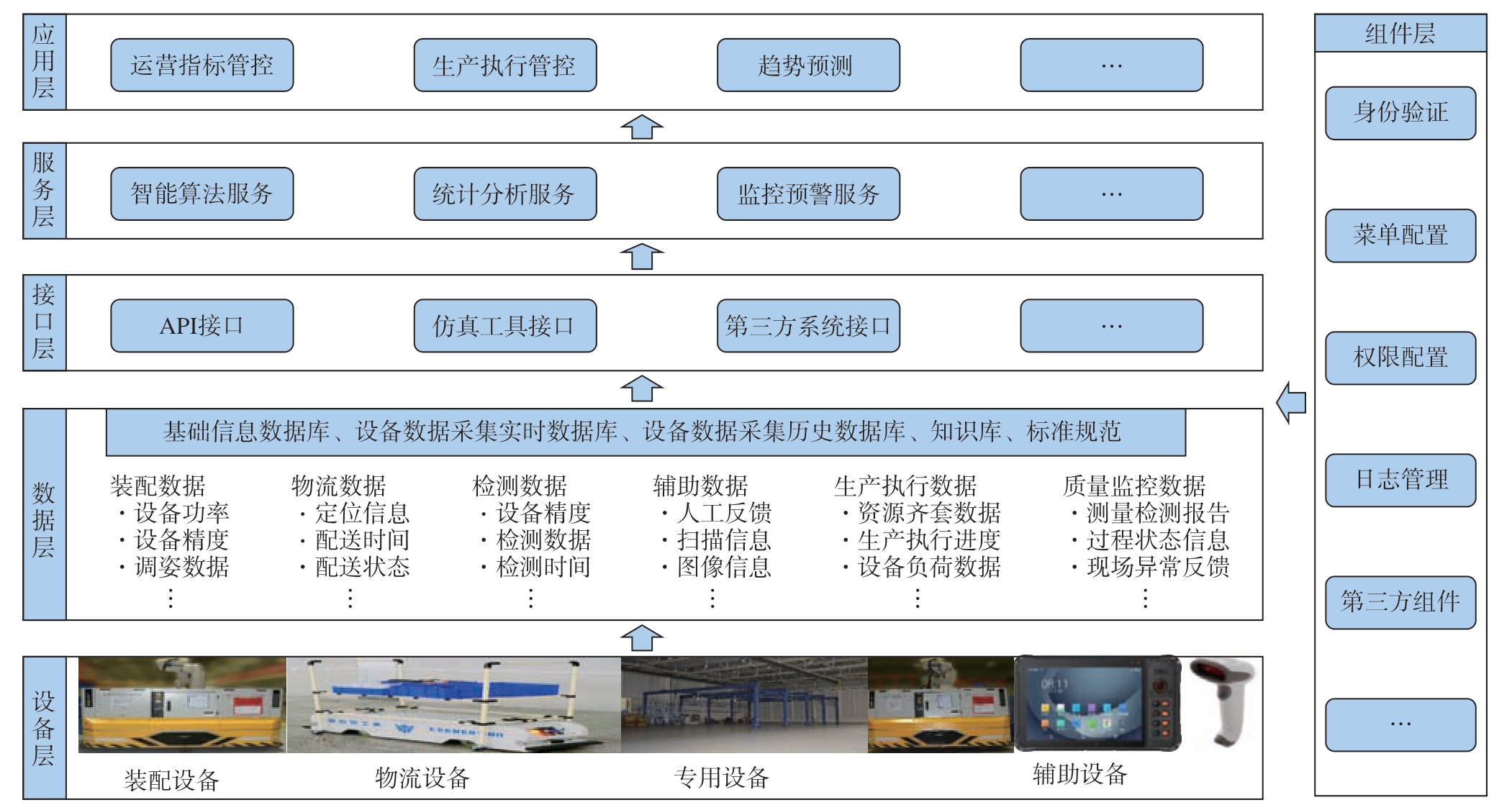 飞机总装数字孪生系统架构包括设备层、数据层、接口层、服务层及应用层5层结构及组件层,如图5所示。设备层主要包括装配设备、物流设备、专用设备、辅助设备,分别为垂尾自动化对接装置、AGV小车、测试中心设备、数据采集终端设备等,主要采集安装过程数据、空间位置数据、测试测量数据及其他交互数据。数据层主要包括基础信息数据库,设备数据采集实时数据库、设备数据采集历史数据库、知识库、标准规范等,依托数据中台将数据进行整合,建立数据服务,为应用层提供数据支撑。接口层包括API接口、仿真工具接口、第三方系统接口等。服务层是以服务的形式封装了系统功能,如智能算法服务、统计分析服务、监控预警服务等。应用层是面向用户的接口,提供指标对比、生产管控、趋势预测等功能。组件层是支撑整个系统正常运行的基础保障,包括身份认证、可视化组件、菜单配置、日志管理等。
