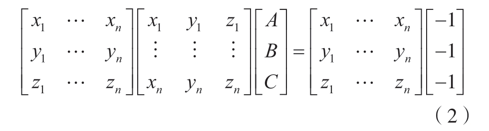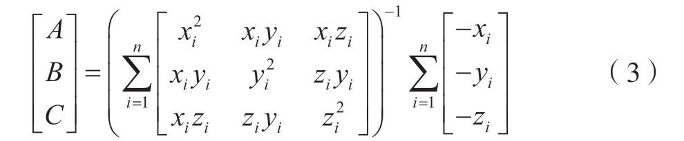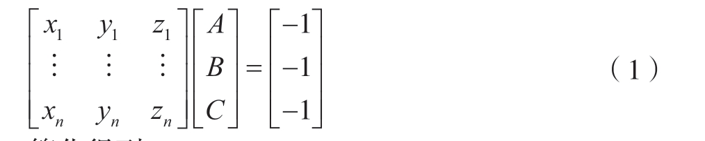 本文使用栅格法和迭代最小二乘拟合滤波算法对扫描仪获取的原始数据进行预处理,然后使用目前比较成熟的最小二乘法原理对平面进行拟合。该方法具有误差小、稳定性好的特点,其基本思想:三维空间中的平面方程可表示为AX + BY + CZ + 1 = 0(参数A、B、C 是描述三维空间特征的常数)。平面在使用n 个离散空间点拟合平面时,其平面方程可表示为
