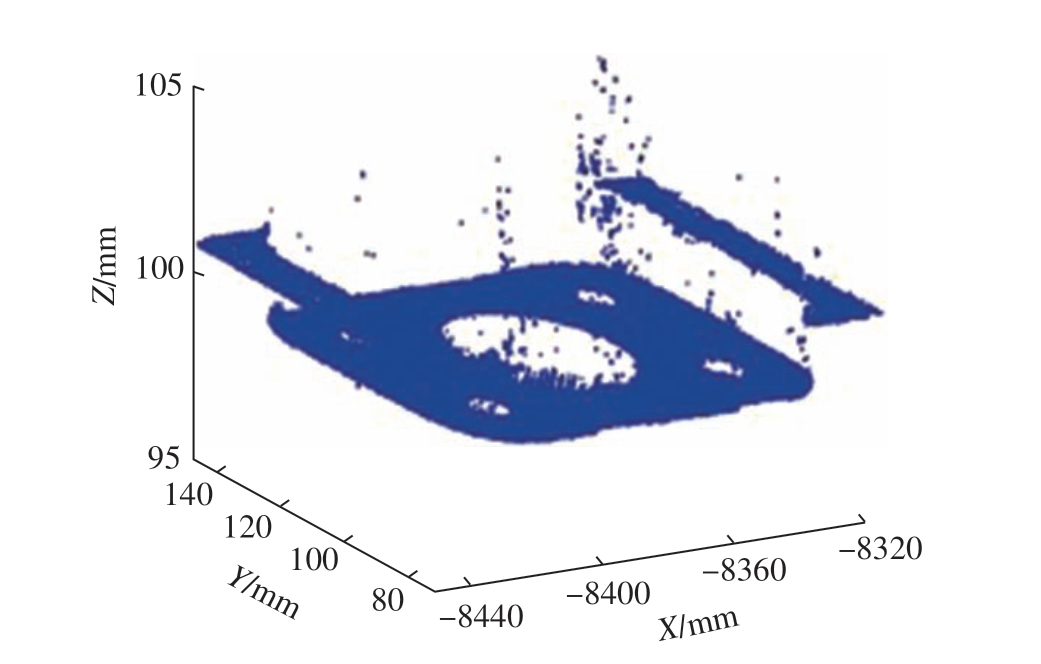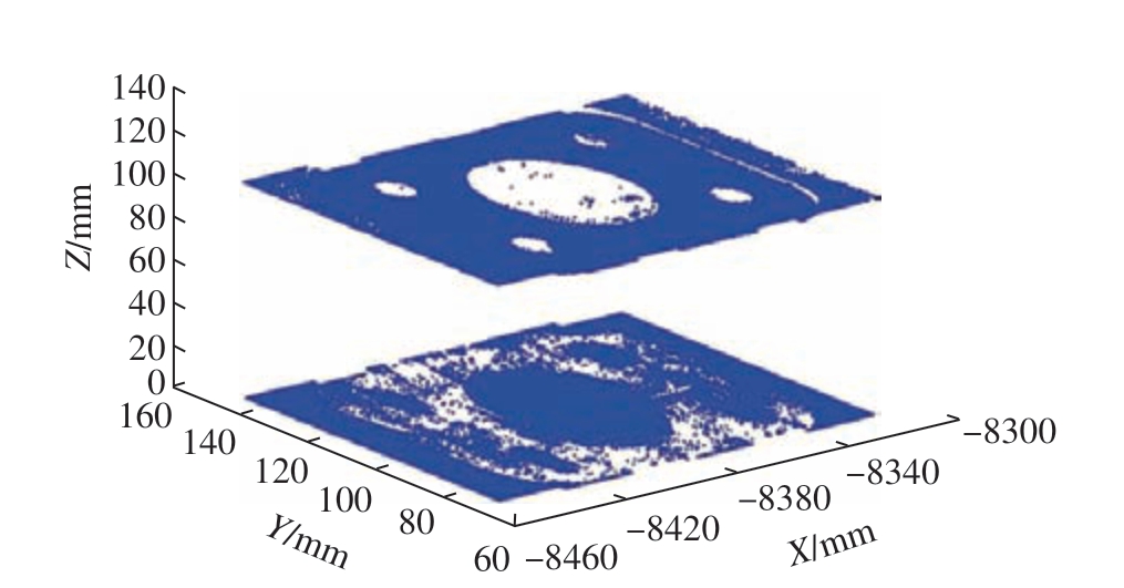 在某批产型飞机装配过程中,对部件A 与部件B进行精加工试验。扫描仪测量完成对接面的测量后得到原始点云数据分布,如图7 所示。可以看出,点云中存在大量的干扰点。激光轮廓扫描仪的Z 向有效扫描距离为90 ~115 mm,故首先保留有效测量范围内的测量点,剔除其他的点集合。经过数据处理后,得到图8 所示点数据图像,观察图像可知,扫描点数据中除了加工对接面特征,还包括外围工装卡爪表面点特征信息。