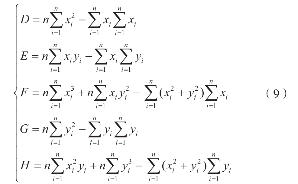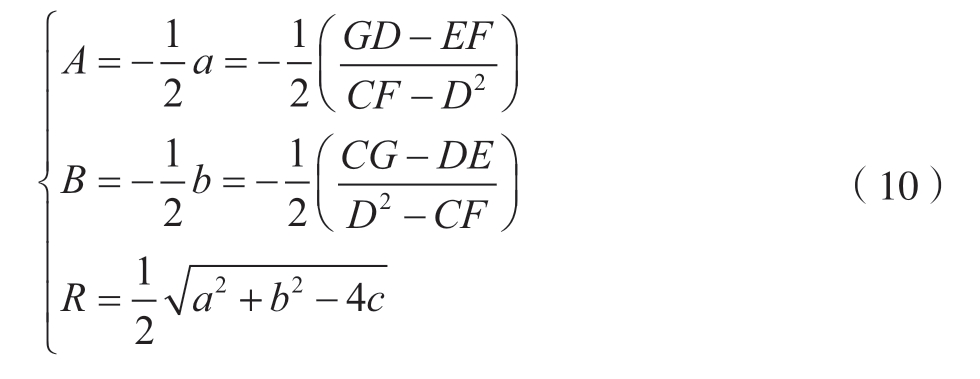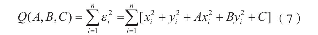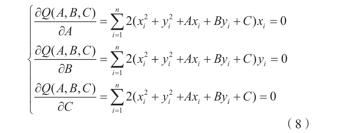 令式 (6)中A = – 2 X1,B = – 2Y1,C =X12+Y12–R12,拟合孔边界的目标函数为Q(A,B,C),则式(5)可以表示为