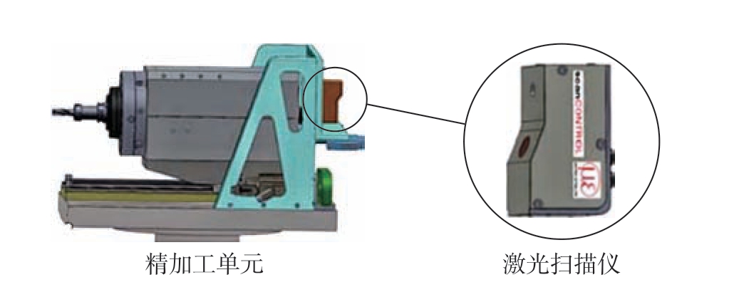 运动单元由X、Y、Z 3 个方向的直线运动导轨与A 方向旋转工作台组成。旋转工作台的主要功能是实现加工单元在部件A 对合面和部件B 对合面之间旋转,从而实现单个主轴双向加工。加工单元主要用于实现对大部件对合面的铣削和制孔,包括电主轴、刀库、自动换刀机械臂等。为满足高速铣削与制孔,选用SIEMENS 公司的2SP1202 电主轴,可保证对接面的铣削制孔精度。测量单元主要功能是检测对合面平面与孔位置度。通过激光扫描仪获取对接面轮廓特征数据,通过数据处理计算出对接面相关加工参数。如图4 所示,激光扫描仪安装在电主轴安装座后面。