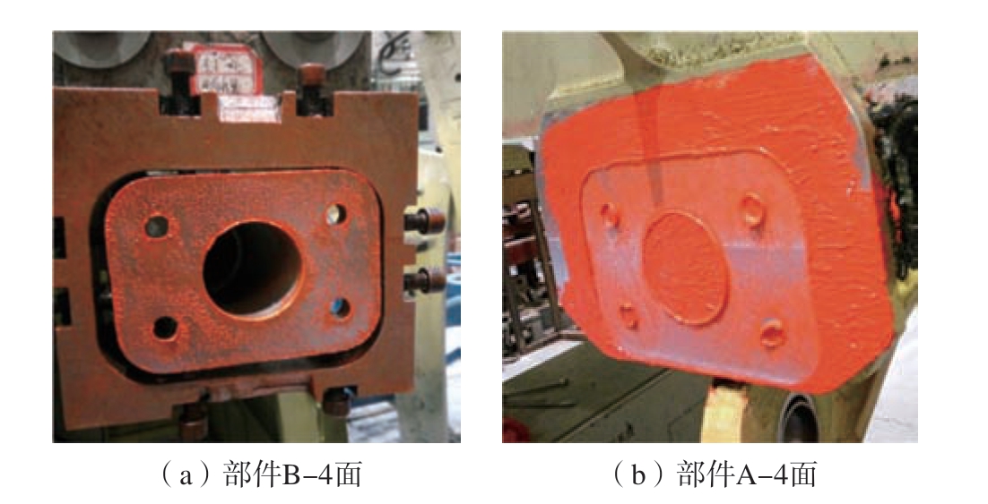 利用激光扫描仪将8 个对接面轮廓全部扫描完成后,通过编写的姿态转换MATLAB 算法及测量计算软件,计算出每个对接面的高点、低点坐标值以及每个对接面的对接加工量,电主轴夹持面铣刀依次对每个对接面进行铣削加工。所有对接面铣削完成后,将部件B 与部件A 对接面贴合,使用塞尺和红丹粉对对接面贴合度进行检测。如图12 所示,红丹粉分布均匀,使用塞尺测得的4 组贴合面贴合间隙小于0.05 mm,表明平面对接度是满足要求的。对接面全部铣削完成并检验合格后,即可开始对接面的铣削制孔工作。根据激光轮廓扫描仪获取的对接面基准孔坐标位置依次对8 个对接面进行制孔、扩孔操作。图13 分别为部件A 和部件B 对接面孔加工后的实物图。