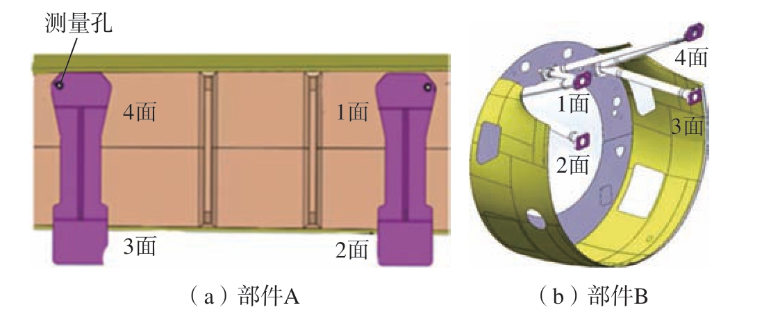 待加工测量的大部件结构如图1(a)所示,部件A航向侧安装有4 个对接面,与安装在部件B(图1(b))上W 杆端的对接面一一对应。部件A 对接面设计有0.5 mm 的加工余量,对接面上没有初孔,1 面和4 面预制有两个Φ6 mm 的定位孔,用于部件A 在调姿过程中的测量定位。部件B 对接面设计预留有2 mm 的加工余量,4个对接面上分别有Φ10 mm和Φ11 mm的初始对接孔。
