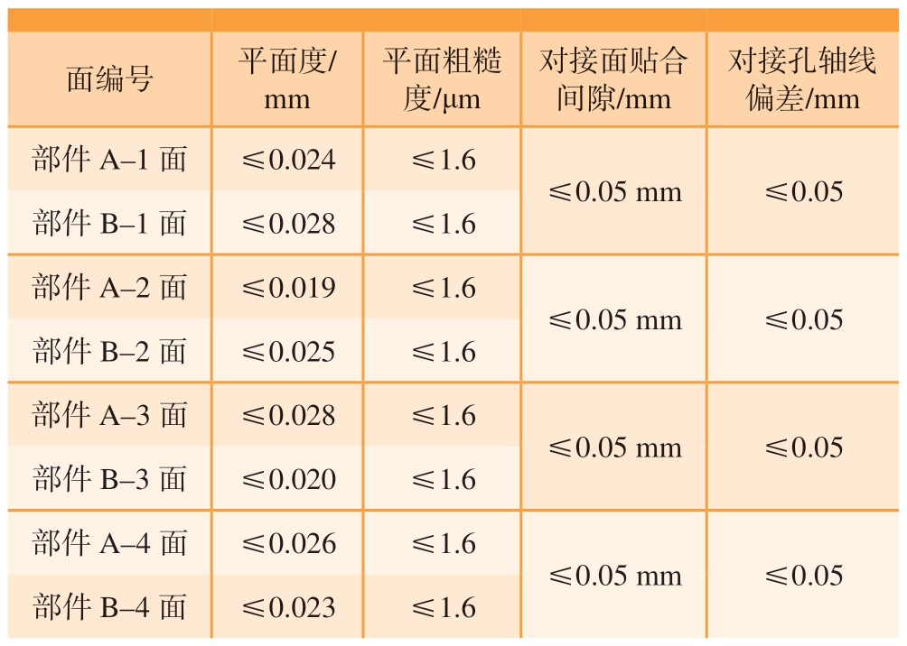 面编号平面度/mm平面粗糙度/μm对接面贴合间隙/mm对接孔轴线偏差/mm部件A–1 面≤0.024≤1.6≤0.05 mm≤0.05部件B–1 面≤0.028≤1.6部件A–2 面≤0.019≤1.6≤0.05 mm≤0.05部件B–2 面≤0.025≤1.6部件A–3 面≤0.028≤1.6≤0.05 mm≤0.05部件B–3 面≤0.020≤1.6部件A–4 面≤0.026≤1.6≤0.05 mm≤0.05部件B–4 面≤0.023≤1.6