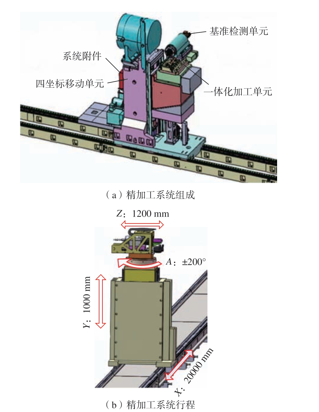 为了完成部件A 和部件B 的精准装配对接,精加工系统应能在不同工位实现部件A 和部件B 对接面的加工。如图3 所示,选用卧式数控机床作为加工设备,将设备安装在X 方向直线运动的导轨上,用于加工部件A 与部件B 的对合面。精加工系统共分运动单元、加工单元、测量单元3 个工作单元,其总体控制选用西门子840D 控制系统。