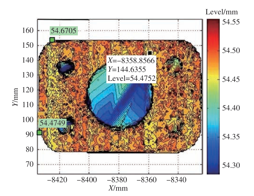 接着根据标定的扫描仪坐标系和加工坐标系之间的转换关系,将保留的每个点云数据的坐标转换到加工坐标系下,使用最小二乘法原理对平面进行拟合,同时使用MATLAB 的Contour3 功能绘制拟合成的平面的三维空间等高线效果图,如图11 所示,其中的两个显示点分别表示该平面的最高点和最低点,根据颜色分布可直观显示对接面特征。