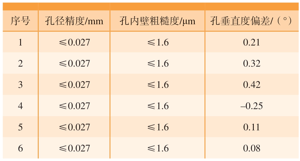 序号 孔径精度/mm孔内壁粗糙度/μm 孔垂直度偏差/(°)1≤0.027≤1.60.21 2≤0.027≤1.60.32 3≤0.027≤1.60.42 4≤0.027≤1.6–0.25 5≤0.027≤1.60.11 6≤0.027≤1.60.08