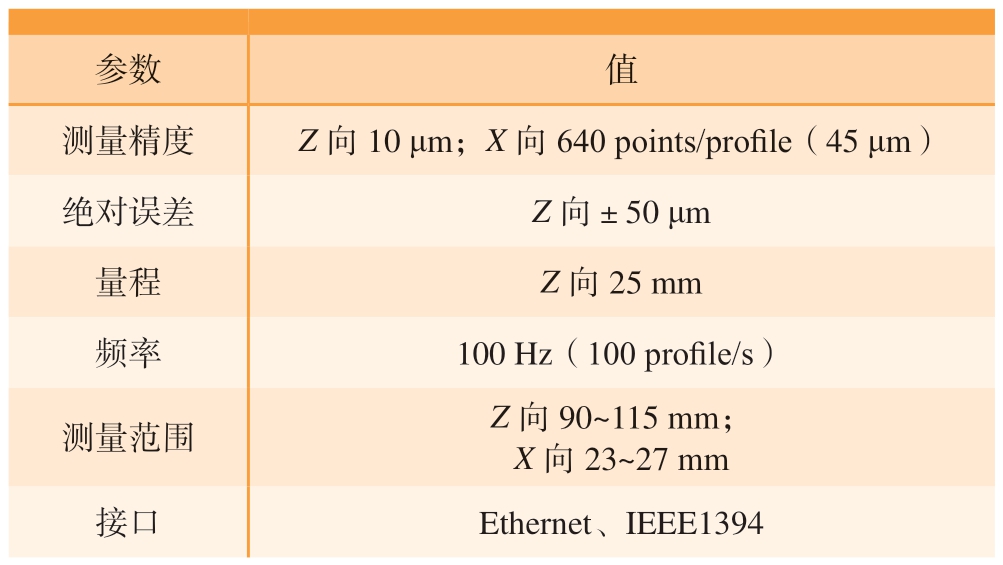 激光轮廓扫描仪采用激光三角反射式测量原理,用于测量采集不同物体表面的二维轮廓数据。该测量系统采用线扫描方式,单次扫描获取的特征点非常多,具有较快的扫描速度和较高的精度。激光轮廓扫描仪扫描时获取的是CCD 传感器与被测物体表面上点间的距离 (Z 轴),以及平面点与激光线中心间的距离 (X 轴)信息,最终获取的是以CCD 传感器为原点的二维点云数据。移动被测物体或者激光扫描仪,加入Y 轴坐标,即可得到一组被测物表面三维坐标数据。本研究选用德国MICRO-EPSILON ScanControl 2700 – 25 高速线激光轮廓扫描仪,其性能参数见表2。