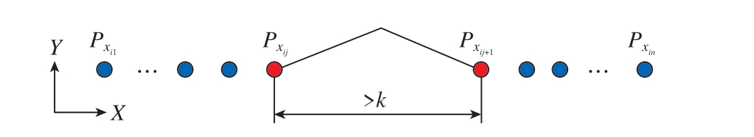 本文使用扫描线法对点云数据进行预处理并进行边界特征提取。具体思路:首先将获得的三维点云数据向XY 平面投影,接着令点云中所有数据点的Z 坐标值为0,把其转化为二维点云,将点云中各数据点的Y 坐标值按大小进行排序分组,且考虑到存在测量误差δ,因此将点云中Y 坐标值在[yi,yi+δ]范围内的点分为一组。另外,可对每条扫描线中的点云数据按照各点的X 坐标值大小进行组内排序以简化数据处理难度。然后将排过顺序的全部点云数据分别存储在两个链表Xi =(1~n)及Yi =(1~n)中。在按照点云各个数据点的X 坐标值大小排序的链表组Xi =(1~n)内,可查询出组内点云数据中X 坐标值最大为Xmax 和最小为Xmin 的数据点。对点云数据进行处理时,首先根据链表组中点云数据的密度ρ 建立一个最小包围盒 (Xi,Xi+1),接着提取链表组中在(Xi,Xi+1)范围内的所有数据点,设为点集Pxi,并对点集Pxi 中包含的所有数据点按照其Y 坐标值的大小进行排序并编号,其中第i 组内第j 个点可表示为Pxij (i=1,…,m; j=1,…,n),最后查询相邻两点ti = Pxij+1(y) – Pxij(y)(j = 1,…,n)间的距离,若ti 大于设定值k(一般为ρ 的5~10 倍),则yi+1、yi 两点即可作为基准孔的边界特征点,孔边界提取原理如图6 所示。