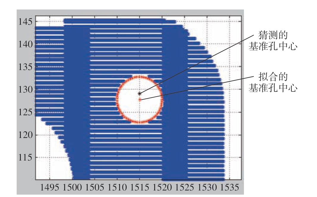 对点云数据进行网格化划分,网格大小为3 mm×3 mm,接着对点云数据进行迭代滤波处理得到图9 所示的点云数据分布图,可以看出,经过处理后,对接面上的杂点已经被过滤掉。经过对原始点云数据进行预处理,拟合的对接面特征较好,杂点已经基本滤除。接着使用基于扫描线法的孔边界特征提取算法对基准孔边界特征进行提取,并利用最小二乘法原理对基准孔坐标位置进行提取计算,提取的基准孔边界和孔中心如图10所示。基准孔边界提取完成后,猜测孔中心坐标O =(1515 mm,128 mm),孔半径为5 mm,拟合出的孔中心坐标O =(1515.007 mm,127.745 mm),半径R 为5.08 mm。经过多次扫描试验,拟合出的孔半径值已经接近实际孔半径值,误差值不大于0.1 mm。