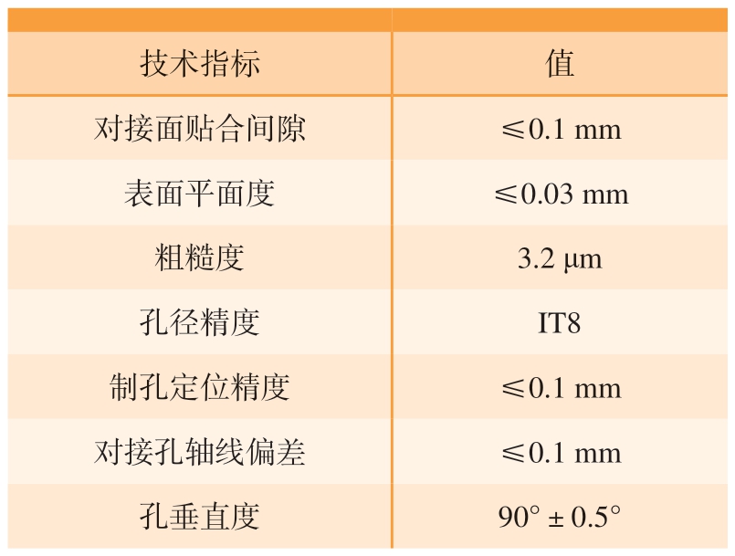 技术指标值对接面贴合间隙≤0.1 mm表面平面度≤0.03 mm粗糙度3.2 μm孔径精度IT8制孔定位精度≤0.1 mm对接孔轴线偏差≤0.1 mm孔垂直度90°±0.5°