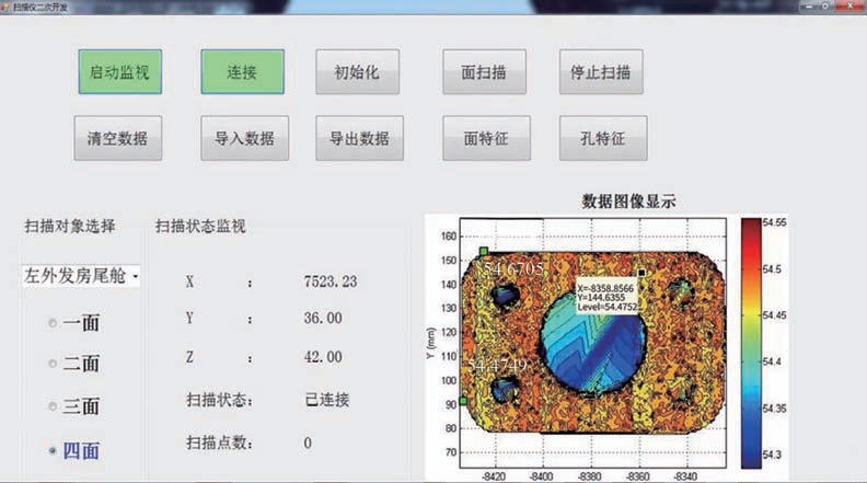 每进行一次部件A 和B 的精加工,系统中需要扫描8 个对接面,且扫描时每个面的扫描参数都不同,因此基于NC_DDE(dynamic data exchange)服务器对840D sl 控制系统进行了二次开发,编写了激光轮廓扫描仪的软件界面。如图5 所示,该软件可以实现激光轮廓扫描仪与西门子840D sl 控制系统的连接、断开、测量数据的导入导出、扫描仪实时位置显示等功能。对接面扫描结束后,利用MATLAB 设计的面特征和基准孔特征提取算法对获取的大量点云数据进行处理运算,获取对接面的平面特征和基准孔中心坐标位置及拟合的孔半径值,并在数据图像显示区以三维空间等高线图进行直观显示。