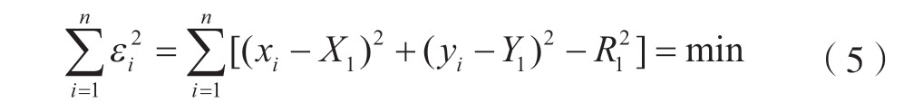 同理,将Yi =(1~n)链表组中的点云数据按照Y 坐标值大小进行排序,并建立最小包围盒 (Yi,Yi+1),在最小包围盒中的点集设为Pyi,最后在点集Pyi 中按照所有数据点的X 坐标值大小进行排序,其中第i 组内第j 个点可表示为Pyij (i = 1,…,m;j=1,…,n),接着提取点集Pyi 中相邻两点之间的距离,若大于给定值,则该两点可视为孔的边界点。X 和Y 方向边界提取完之后,把提取的重复点去掉,完成整个基准孔的边界提取。基准孔边界特征提取完成后,在使用MATLAB 绘制拟合成的平面的三维空间等高线效果图中可测量出基准孔大概中心坐标O =(X1,Y1),以及孔半径R1。假设边界点到拟合的圆的残差为ε,使用最小二乘法原理对获得的圆形边界点进行拟合,原理如下。