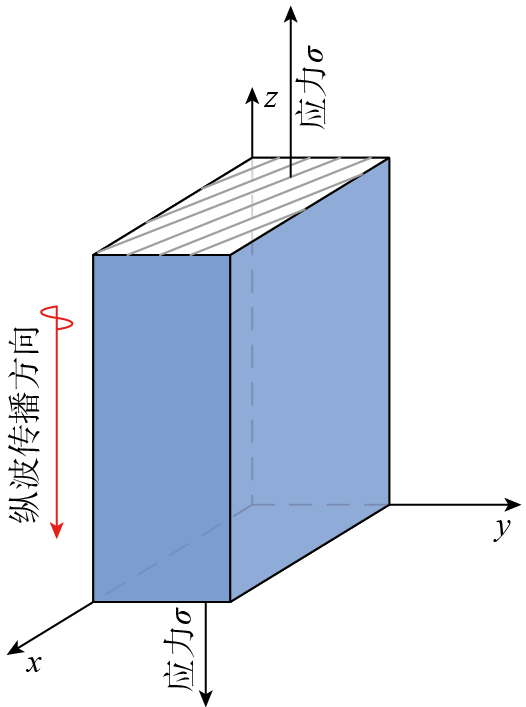 声弹性效应是指超声波在弹性介质中传播时,其声速等传播特性随介质应力、应变状态变化的现象,介质应力变化导致内部质点间的相互作用力和平衡位置改变,介质弹性常数变化,进而影响超声波的传播速度。以纵波为例,如图1所示,在材料内部z轴方向存在应力场,纵波沿z轴传播,其传播速度的计算如下[