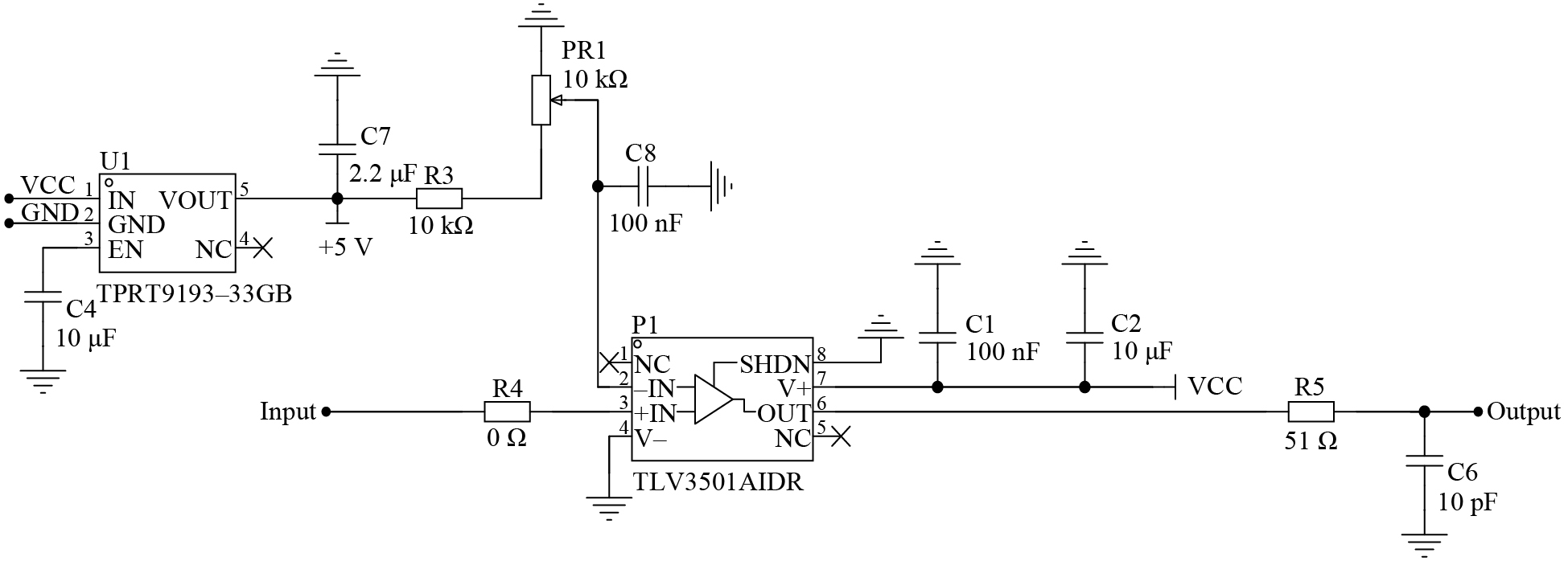 为了计算飞行时间,需要对信号发射和接收时刻进行计时,采用时间数字转换芯片,在开始计时与终止计时利用标准电平触发。但放大的回波信号无法触发停止计时,因此设计高速比较电路,如图10所示,将超声回波信号转换为TTL电平。选用TLV3501芯片(美国德州仪器),其轨至轨的推挽输出满足TTL接口要求,120 MHz的带宽远超超声信号频率,保证了信号处理的实时准确。比较器输出接TDC–GP22计时端口,工作电压为2.7~5.5 V,与5 V电源兼容。此外,本文采用同相比较模式,利用回波上升沿触发测量。