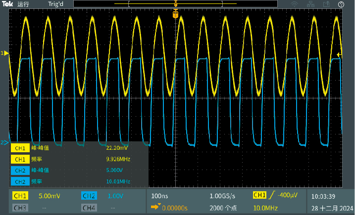 对高速比较电路进行超声信号测试,如图11所示。其中,通道1(CH1)为10 MHz的超声信号,通道2(CH2)为超声波信号经过高速比较后输出的信号,可以看出,超声波经过高速比较电路转换为标准电平信号的转换效果良好。