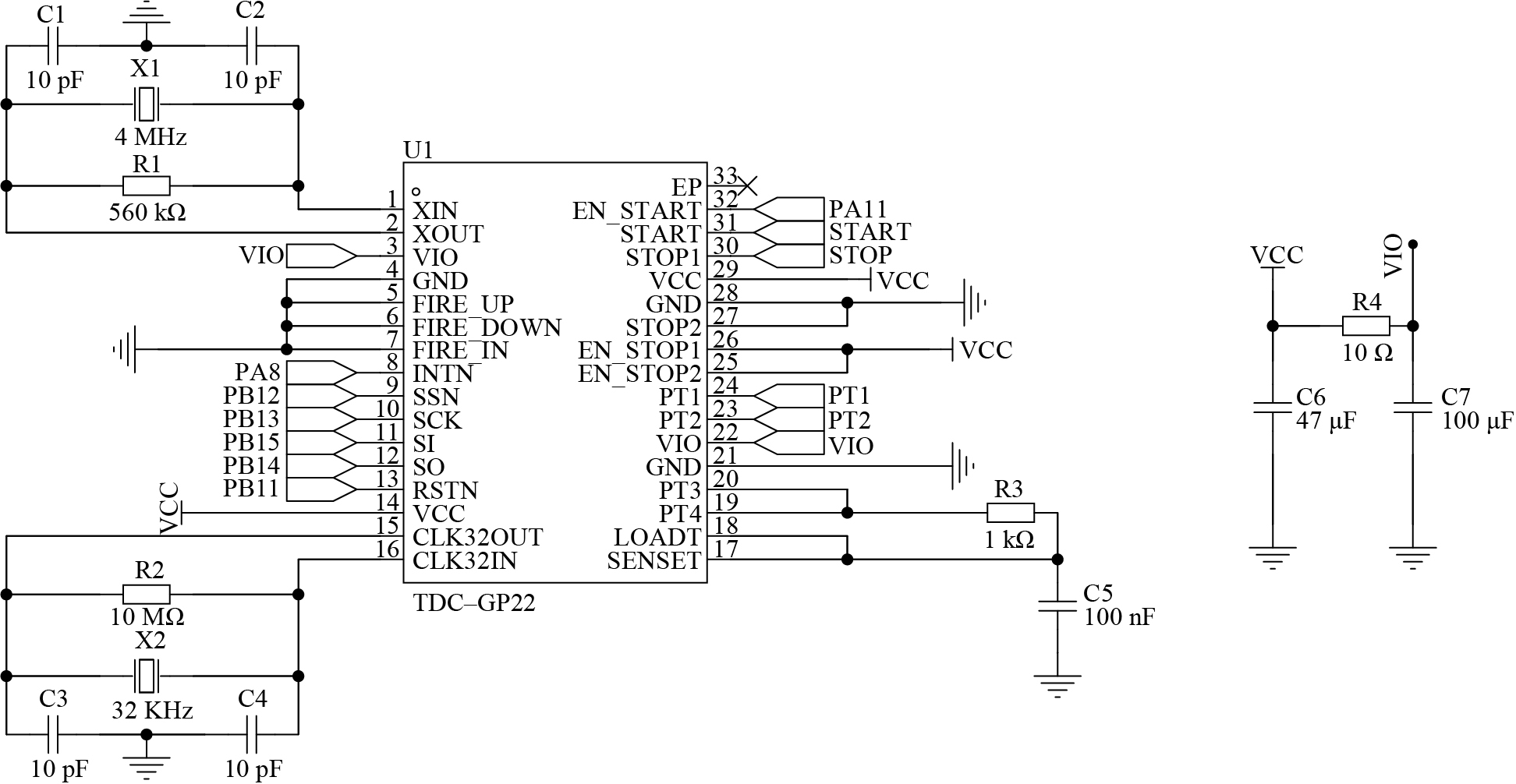 螺栓内超声波飞行时间的精确测量采用微处理器搭配时间数字转换芯片的方案,高精度时差测量芯片TDC–GP22的正常运行依赖两个外部晶振(4 MHz的高速时钟晶振),该晶振具有成本低廉和快速起振的优势,但存在0.3%~0.5%的误差,并且会受到温度漂移的影响。因此,为了实现精确的时钟校准测量,采用1个32.768 kHz的晶振作为测量基准。TDC–GP22的外围电路如图12所示。
