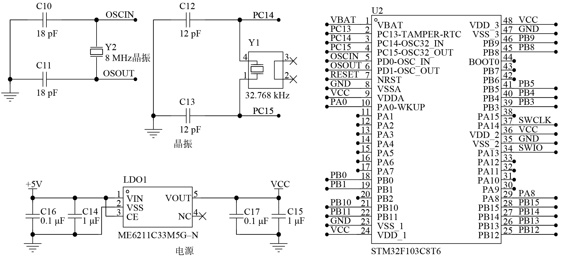 STM32F103是意法半导体推出的基于ARM Cortex–M3内核的微处理器,具有丰富的外设接口和高速计算处理能力,将该微处理器与TDC–GP22进行搭配使用。STM32F103C8T6的外围电路如图13所示,通过GPIO引脚对TDC–GP22进行控制,通过SPI通信方式对TDC–GP22的内部寄存器进行读写。