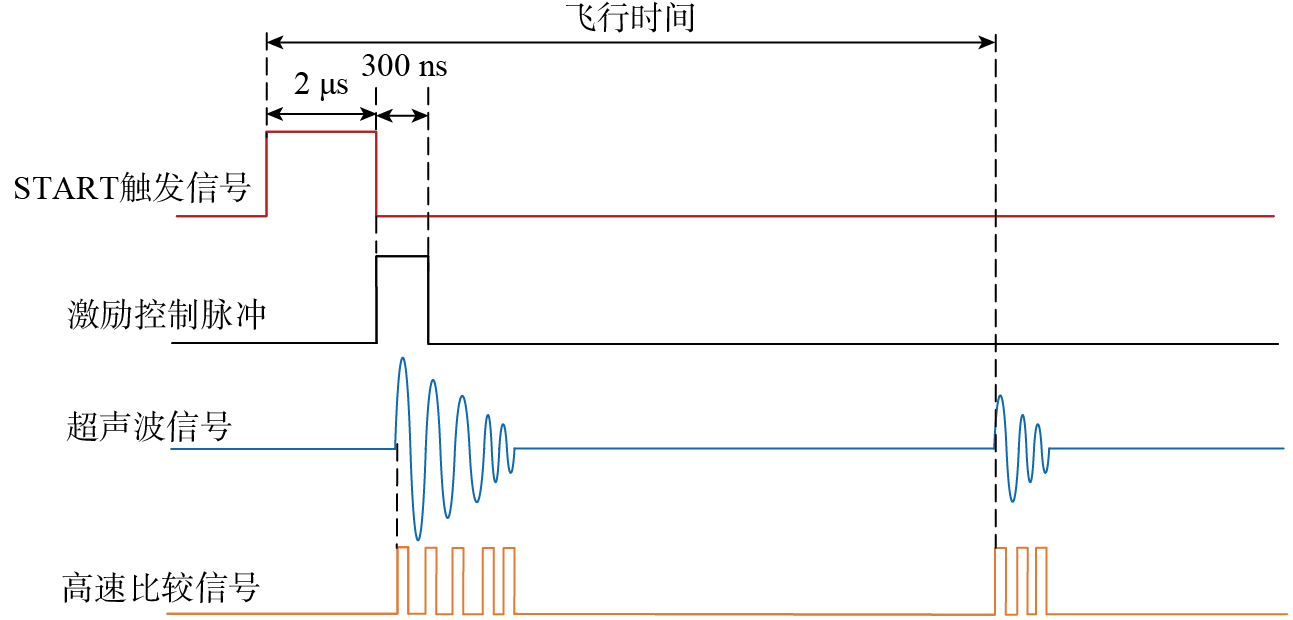 若以控制脉冲作为TDC的开始计时信号,此时STOP屏蔽功能未成功启用,则超声波初始信号经高速比较后会被误判为STOP信号,输入STOP1通道,使得计时提前停止。为了顺利启用STOP屏蔽功能,将START引脚启动信号提前2 μs至激励信号前,脉冲时序设计如图15所示。可以看出,虽然单次测量值会增加2 μs,但飞行时间差通过两次测量差值得到,并不影响最终时间差测量结果。