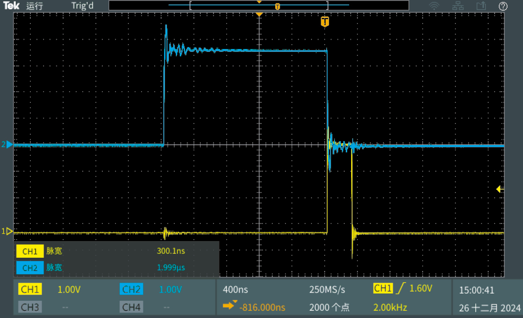 本文基于计数器原理实现脉冲时序控制,需生成300 ns和2 µs脉冲,2 µs脉冲下降沿与300 ns脉冲上升沿对齐,且二者重复频率相同。频率计数器负责生成2 μs可调频率方波,窄脉冲计数器控制生成300 ns方波,2 μs脉冲下降沿触发计数,开始生成300 ns脉冲,计数完成后信号拉低。生成的脉冲时序如图16所示,可以看出,通道1的脉冲宽度为300 ns,通道2的脉冲宽度为2 µs,且通道2上升沿对应通道1的下降沿,时序精准,高效同步。