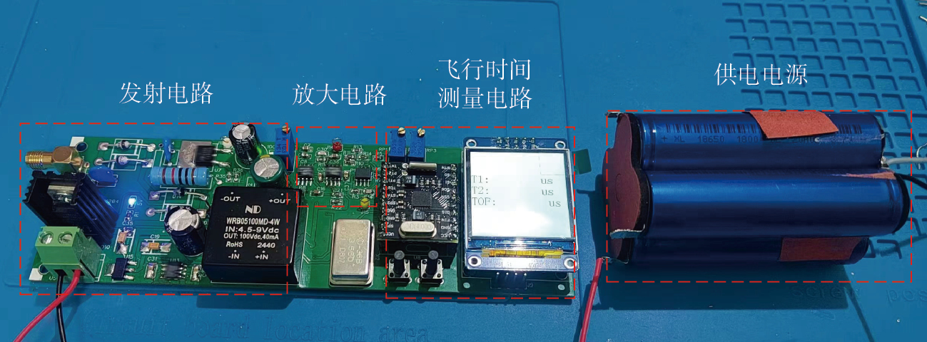 预紧力测量系统由发射电路、回波信号处理电路(放大电路)、飞行时间测量电路及供电电源集成而成,如图17所示,将超声波发射电路与飞行时间测量模块独立布局,按照信号流向进行器件的拓扑排布,并对模拟/数字地平面实施分区隔离。发射电路使用12 V转100 V的升压电源提供高压;供电电源附近使用电解电容;放大电路通过零欧姆电阻构建低阻抗噪声抑制通道,降低共模干扰;飞行时间测量电路中使用高精度石英晶振,以提升测量系统的稳定性。