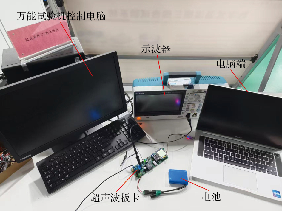 标定试验时要确保万能试验机的恒温箱干净整洁、温度稳定,标定环境如图21所示。在标定时,首先调节万能拉伸试验机归零,消除初始应力,采用示波器记录稳定的超声波初始回波信号;随后设置万能拉伸试验机的加载参数,拉伸试件,待拉力稳定60 s后,测量超声波飞行时间;最后,循环加载、测量并记录数据,直到拉力达到预设的总载荷。