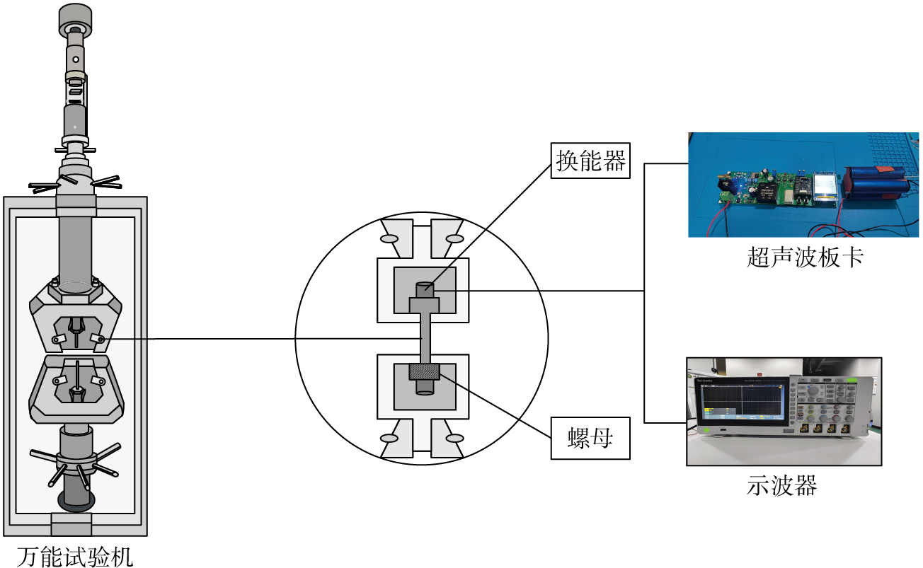 为了建立超声波飞行时间差与螺栓预紧力之间的定量关系,采用万能拉伸试验机进行标定试验(图19)。选用A2–70螺栓(M12×50、M14×60、M12×100)和12.9级35CrMo合金钢高强度螺栓(M12×100)作为试验对象。M12和M14属于中等尺寸螺栓,广泛应用于航空航天、车辆等关键连接部位,具有较高的工业普适性。M12不锈钢螺栓应用在通用机械紧固场景中时,标准预紧力为26.5 kN,一般应用场合要求预紧误差为21.2~31.8 kN,即最大不超过标准预紧力的20%;应用于航空内饰紧固时,需要精确预紧、防松,误差要求在24.4~28.6 kN(±8%)以内。M12不锈钢螺栓配套使用的中心频率为5 MHz,直径为8 mm(小于螺栓端面直径),侧方接口的是单晶超声换能器,黏附在螺栓端面的中间位置。采用TBS2074B型示波器(美国泰克)观察回波信号;加载装置选用UTM5504型拉伸试验机(中国三思纵横),量程为50 kN,试验力精度优于1%。