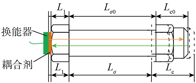 如图2所示,将超声波换能器通过耦合剂放置在螺栓头端面,产生超声波信号,并实现反射信号接收。在未施加预紧力时,超声波在螺栓内的传播路径总长Lh包括3个主要部分:螺栓头长度L1、无应力夹紧长度Lσ0及无应力螺杆长度Lc0[