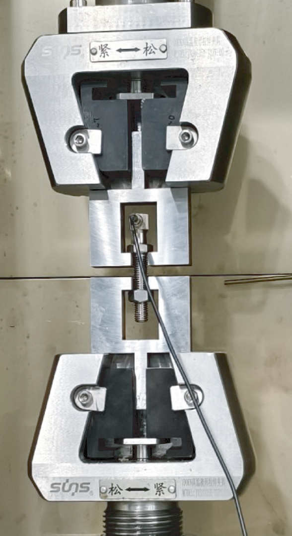 进行标定试验前专门设计并加工了适配工装,由40Cr板材电火花切割加工而成,其硬度指标优于被测螺栓材料,如图20所示,夹具中心孔轴线与拉伸载荷方向严格对中,确保螺栓轴向力的准确施加。选用680厌氧胶(德国乐泰)作为耦合介质,将耦合剂均匀涂覆在换能器表面,进行恒定压力加载直至完全固化,从而降低耦合状态波动引入的测量误差。