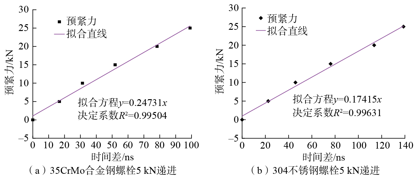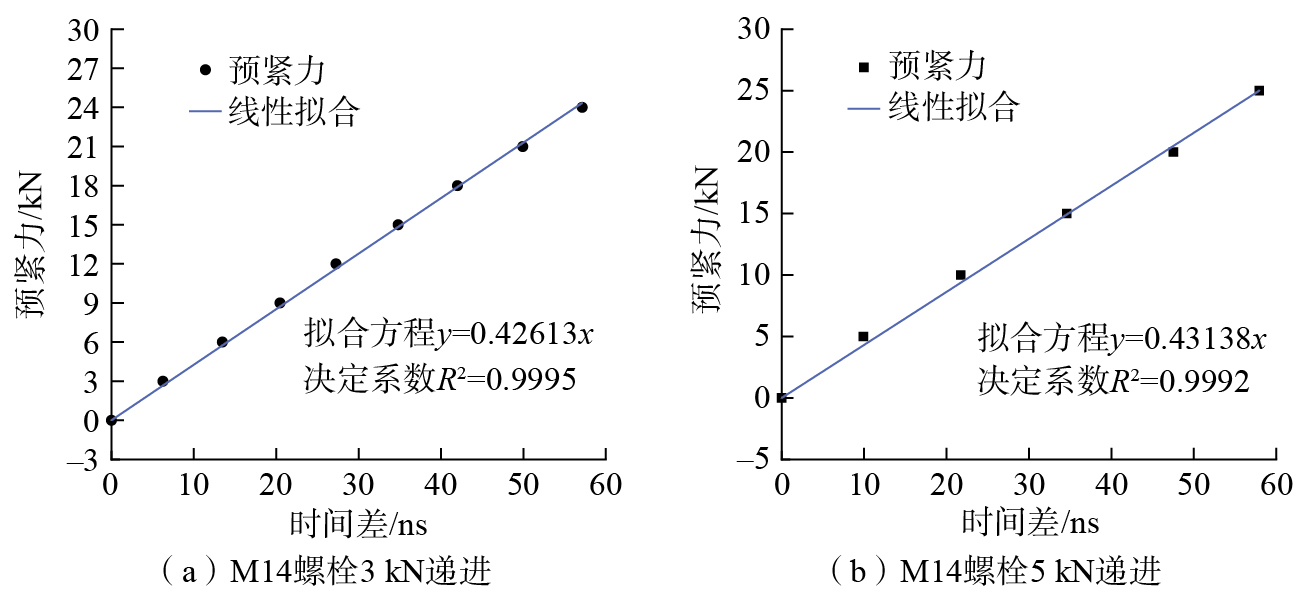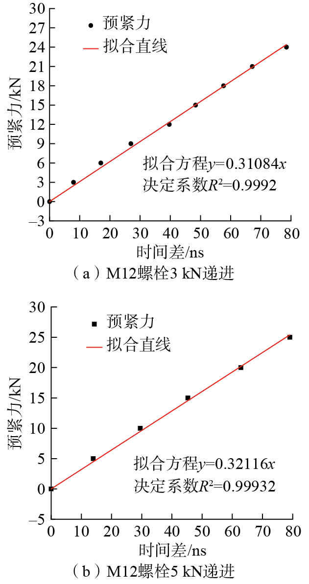 (1)基于超声波声弹效应,建立螺栓预紧力和超声波飞行时间差之间的线性关系模型,万能拉伸试验表明二者拟合直线的决定系数大于0.99,充分验证了线性关系模型的可靠性。