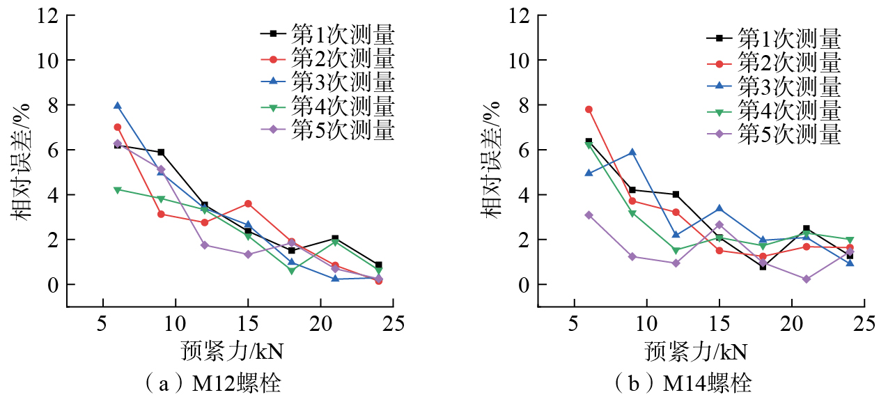 (3)标定结果分析表明,相同材料M12与M14螺栓的标定系数可根据螺栓有效面积、夹持长度进行相互转换,为批量螺栓预紧力的测量提供了条件。预紧力测量结果的相对误差分析表明,预紧力小于15 kN时,测量相对误差在2%~8%之间,当施加预紧力大于15 kN时,测量相对误差稳定在5%以下。
