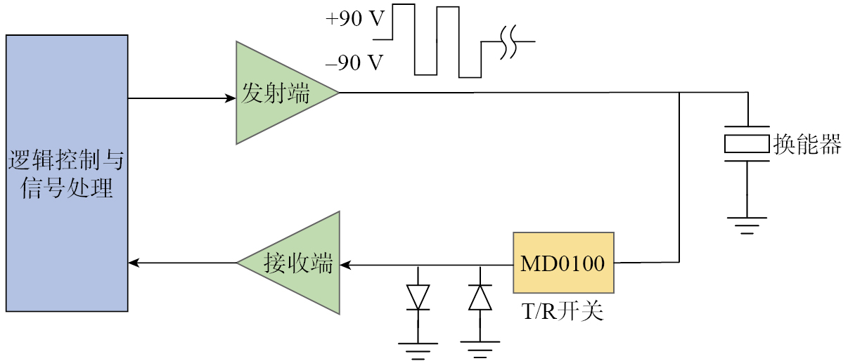 本文所用超声换能器可自发射、自接收,为防止发射信号干扰接收电路,设计了发射、接收切换电路,以保障回波信号顺利传输,隔离高压脉冲,并阻断负高压尖脉冲对后级放大电路的影响。传统的发射、接收切换电路抗干扰性能不足,常规模拟开关的导通电阻大、寄生电容高,容易导致回波信号畸变从而影响飞行时间测量。采用MD0100超声专用T/R开关(微芯公司),可承受±100 V电压。当压降超过±2.0 V时关闭,换能器激励尖脉冲峰值为80 V,在安全范围内,此条件下仅允许200 µA电流通过,避免了信号串扰,应用场景见图6。