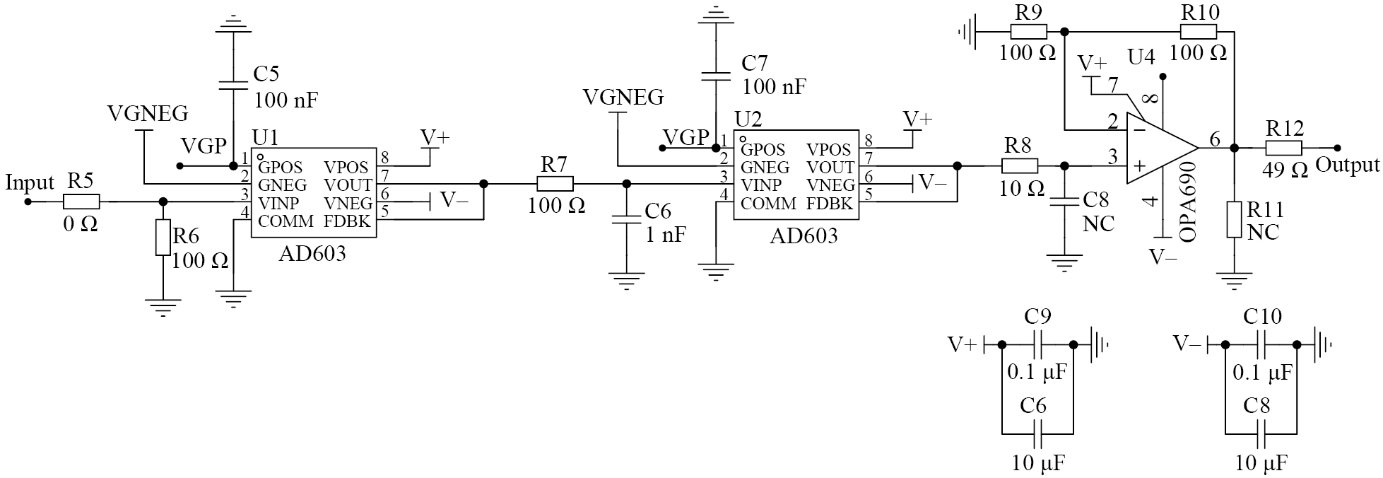 整个放大电路为三级架构,使用两片AD603级联构建信号放大电路,设计如图8所示,前两级采用AD603,工作范围为–10~30 dB。通过第1级VOUT输出接第2级VINP输入,级联提升性能,第3级采用OPA690,增益放大2倍,可抵消前面的衰减,此时电路增益的调节范围扩至–20~60 dB。
