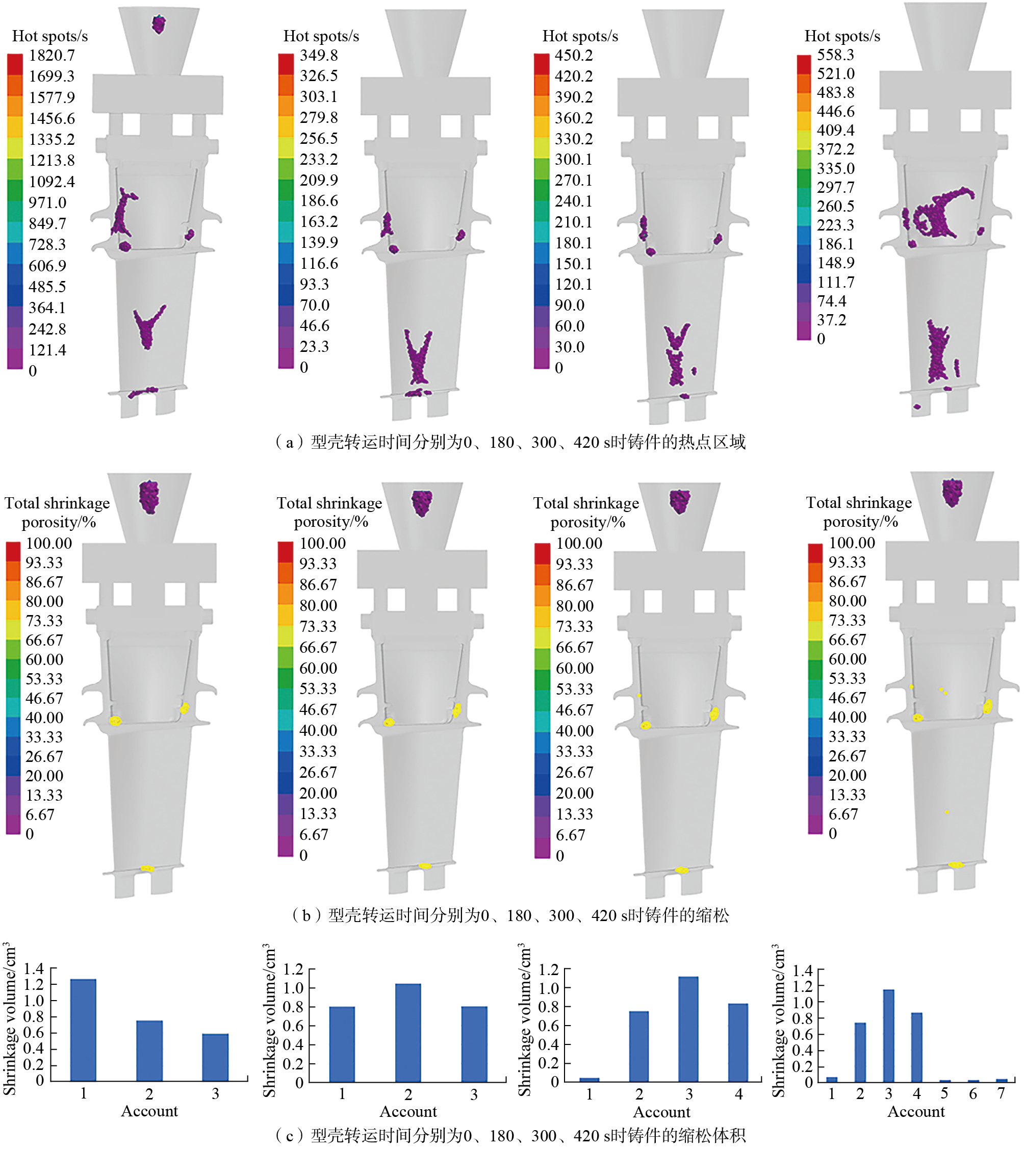 型壳温度是熔模精密铸造过程中一个十分重要的参数,直接影响金属熔体的充型和凝固情况,尤其是对1400 ℃以上高温熔体的流动和凝固有显著影响[ SHEIKH A K, KHAN M A A. Mold design optimization and quality assessment of steel castings through integrated simulations and experiments[J]. Journal of Mechanical Science and Technology, 2020, 34(7): 2975–2983. DING Z Y, WANG D H, GUAN B, et al. Semi-solid plasticity and deformation control of superalloy investment casting[J]. The International Journal of Advanced Manufacturing Technology, 2024, 130(7): 3419–3429. 27-28]。值得注意的是,型壳转运时间越长,型壳温度降幅越大[ RAKOCZY Ł, CYGAN R. Analysis of temperature distribution in shell mould during thin-wall superalloy casting and its effect on the resultant microstructure[J]. Archives of Civil and Mechanical Engineering, 2018, 18(4): 1441–1450. 29]。此外,试验数据表明,壳内温度下降速率既不是线性的,也不是均匀的,特别是在手工搬运模具外壳的过程中,情况更加复杂。因此,研究不同型壳转运时间下的型壳温度变化,以及型壳温度变化对铸件缩松缺陷的影响显得尤为重要[ 李海松, 张琼元, 伍林, 等. 型壳材料对高温合金叶片组织和性能的影响[J]. 特种铸造及有色合金, 2021, 41(1): 103–107.LI Haisong, ZHANG Qiongyuan, WU Lin, et al. Influence of ceramic shell material on the microstructure and properties of superalloy blade[J]. Special Casting & Nonferrous Alloys, 2021, 41(1): 103–107. 30]。Zhao等[ ZHAO D Y, WANG D H, ZHOU L Y, et al. Effect of mold dwell time on shrinkage defects in investment casting of superalloy turbine blade[J]. The International Journal of Advanced Manufacturing Technology, 2024, 132(9): 4473–4487. 31]采用数值模拟的方法研究了型壳转运时间(0、180、300、420 s)对Inconel 718高温合金涡轮叶片熔模铸件收缩缺陷的影响,模拟结果(图1和2)表明,当型壳转运时间从0增加到420 s时,熔模铸件的缩孔面积从3个增加到7个,型壳温度从1000 ℃降低到860 ℃,而总收缩体积从2.6154 cm3增加到2.9398 cm3。这种现象主要源于型壳温度的降低和高温合金铸件内部固相率的演变。
