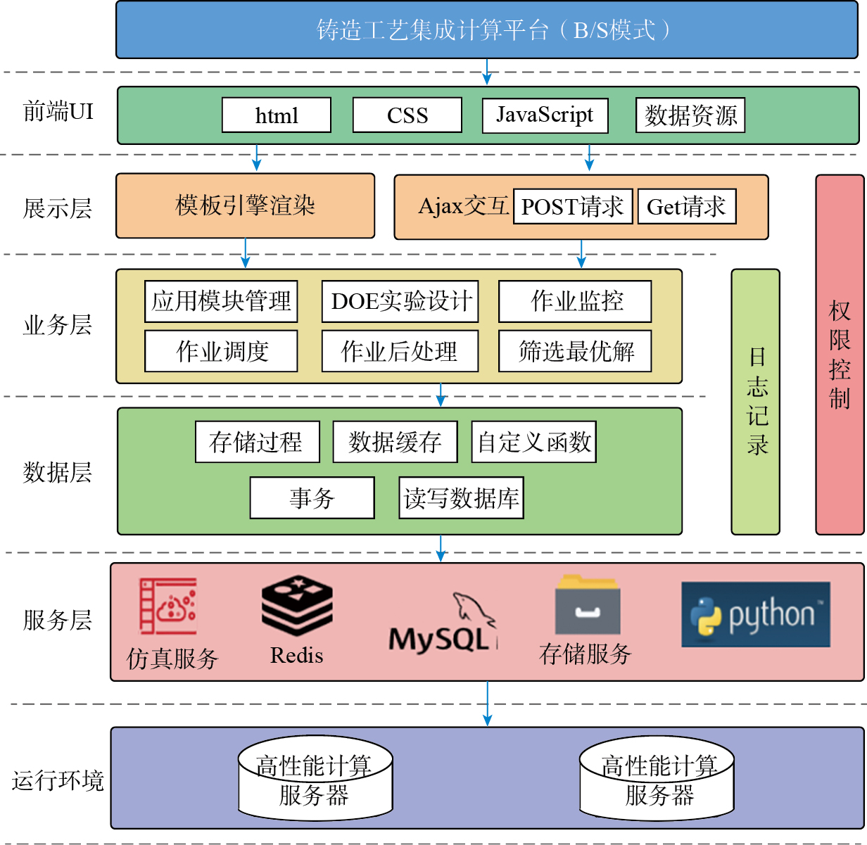 目前,我国在高温合金复杂铸件精铸工艺的智能设计方面还处于起步阶段,不仅缺乏基于全流程的智能控制方法与基础理论指导,还缺乏数字化基础理论与计算模型和方法。国际上,数据驱动的智能铸造已经进入快速发展阶段。英国伯明翰大学在全流程数字化凝固理论与铸造技术方面的研究,以及韩国工业研究院在数字化领域的研究已经较为深入[ GEBELIN J C, JOLLY M R. Modelling of the investment casting process[J]. Journal of Materials Processing Technology, 2003, 135(2–3): 291–300. KIM J, LEE J Y. Server-edge dualized closed-loop data analytics system for cyber-physical system application[J]. Robotics and Computer-Integrated Manufacturing, 2021, 67: 102040. 55-56];此外,Antoniadou等[ ANTONIADOU A, KYPRIANIDIS K, ASLANIDOU I, et al. Design of machine learning method for decision-making support and reliability improvement in the investment casting process[C]//Linköping Electronic Conference Proceedings. Linköping: Linköping University Electronic Press, 2023: 46–53. 57]在熔模铸造过程中将金相照片作为数据输入,利用机器学习工具进行图像识别,用于检测生产件中的缺陷。国内,西北工业大学的研究团队建立了基于几何依赖性的铸件变形预测模型[ ZHANG Y L, BU K, LIU C L. Modeling of casting deformation prediction during investment casting based on geometry dependence[J]. JOM, 2024, 76(12): 6942–6953. 58];华中科技大学自主开发了“华铸CAE”“华铸ERP”“华铸CAD”“华铸FCS”等系列软件产品,并集成形成了“华铸1+N”数字化铸造软件平台系统[ 周建新, 殷亚军, 计效园, 等. 熔模铸造数字化智能化大数据工业软件平台的构建及应用[J]. 铸造, 2021, 70(2): 160–174.ZHOU Jianxin, YIN Yajun, JI Xiaoyuan, et al. Construction and application of digitization, intellectualization and big data industrial software platform for investment casting[J]. Foundry, 2021, 70(2): 160–174. 59];魏鹏啸等[ 魏鹏啸, 郭钊, 丁正一, 等. 熔模铸造工艺集成计算平台开发与应用[J]. 特种铸造及有色合金, 2024, 44(7): 923–927.WEI Pengxiao, GUO Zhao, DING Zhengyi, et al. Development and application of integrated computational platform for investment casting processes[J]. Special Casting & Nonferrous Alloys, 2024, 44(7): 923–927. 60]结合集成计算思想,以计算机仿真模拟与高性能计算服务器为基础,以快速获取最优铸造工艺为目标,设计出了铸造工艺集成计算平台,架构如图10所示。该平台采用Python语言开发,使用了前后端分离的B/S(即浏览器/服务器)框架和MVC(模型Model、视图Views、控制器Controller)设计模式;前端采用Flask框架用于界面开发并且接收和处理数据,后端采用Django框架用于具体功能的实现,这种开发模式的优点是可以在任意浏览器上使用,易于后期的开发维护,极大地减少了系统维护成本。