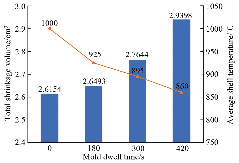 Fig.2 Total shrinkage volume and average shell temperature varying with the increase of mold dwell time[ ZHAO D Y, WANG D H, ZHOU L Y, et al. Effect of mold dwell time on shrinkage defects in investment casting of superalloy turbine blade[J]. The International Journal of Advanced Manufacturing Technology, 2024, 132(9): 4473–4487. 31]