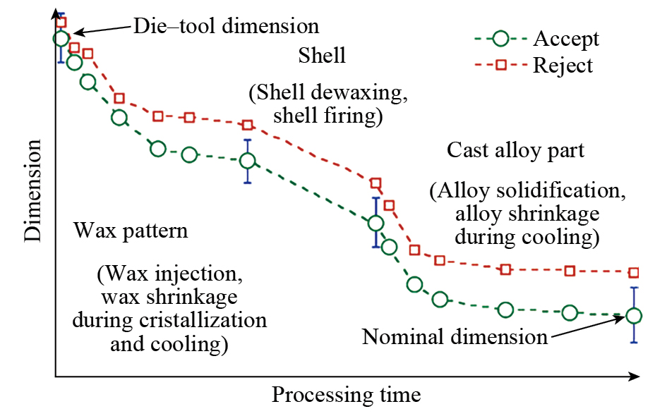 图3 熔模铸造过程的尺寸变化规律示意图[ SABAU A S, CANNELL N. Predicting pattern tooling and casting dimensions for investment casting, phase III[R]. Oak Ridge: US Department of Energy, 2007. 34]