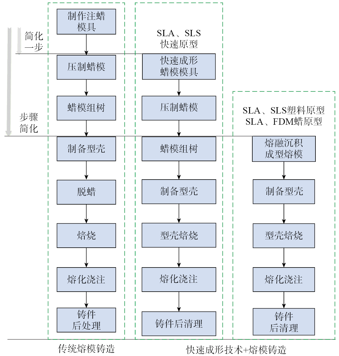 图6 传统熔模铸造工艺与快速熔模铸造工艺比较[ 张浩. 叶轮快速成型及熔模铸造过程仿真研究[D]. 西安: 西安工业大学, 2019.ZHANG Hao. Impeller rapid prototyping and simulation research on investement casting process[D]. Xi’an: Xi’an Technological University, 2019. 41]