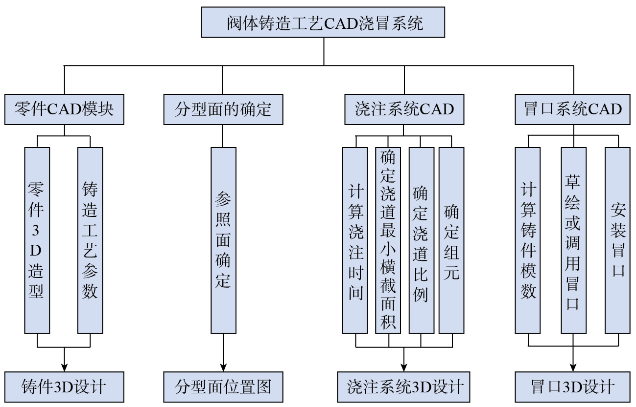 Fig.9 Overall structure diagram of CAD system for valve casting process[ GEBELIN J C, JOLLY M R. Modelling of the investment casting process[J]. Journal of Materials Processing Technology, 2003, 135(2–3): 291–300. 55]