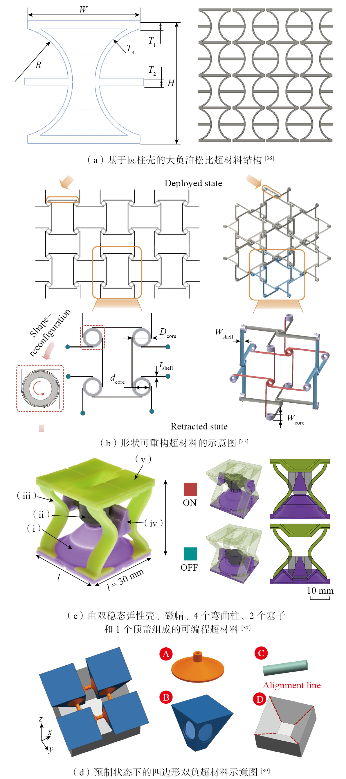 图1 4D打印力学超材料[ LIU K, HAN L, HU W X, et al. 4D printed zero Poisson’s ratio metamaterial with switching function of mechanical and vibration isolation performance[J]. Materials & Design, 2020, 196: 109153. ZHANG X C, HAN Y S, ZHU M, et al. Bio-inspired 4D printed intelligent lattice metamaterials with tunable mechanical property[J]. International Journal of Mechanical Sciences, 2024, 272: 109198. ZHANG J F, MENG S W, WANG B F, et al. Bio-inspired sinusoidal metamaterials: Design, 4D printing, energy-absorbing properties[J]. Machines, 2024, 12(11): 813. ZHENG H K, SUN Y, HAN S H, et al. Rigid–flexible coupling design and reusable impact mitigation of the hierarchical-bistable hybrid metamaterials[J]. International Journal of Impact Engineering, 2024, 194: 105075. QIAO Y, YAN Z M, CHEN J W, et al. Study on thermal metamaterial for uniform surface temperature distribution[J]. Journal of Thermal Science and Engineering Applications, 2024, 16(8): 081008. 10-14]