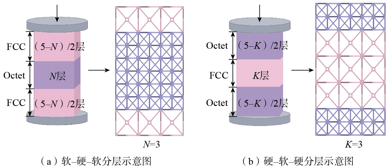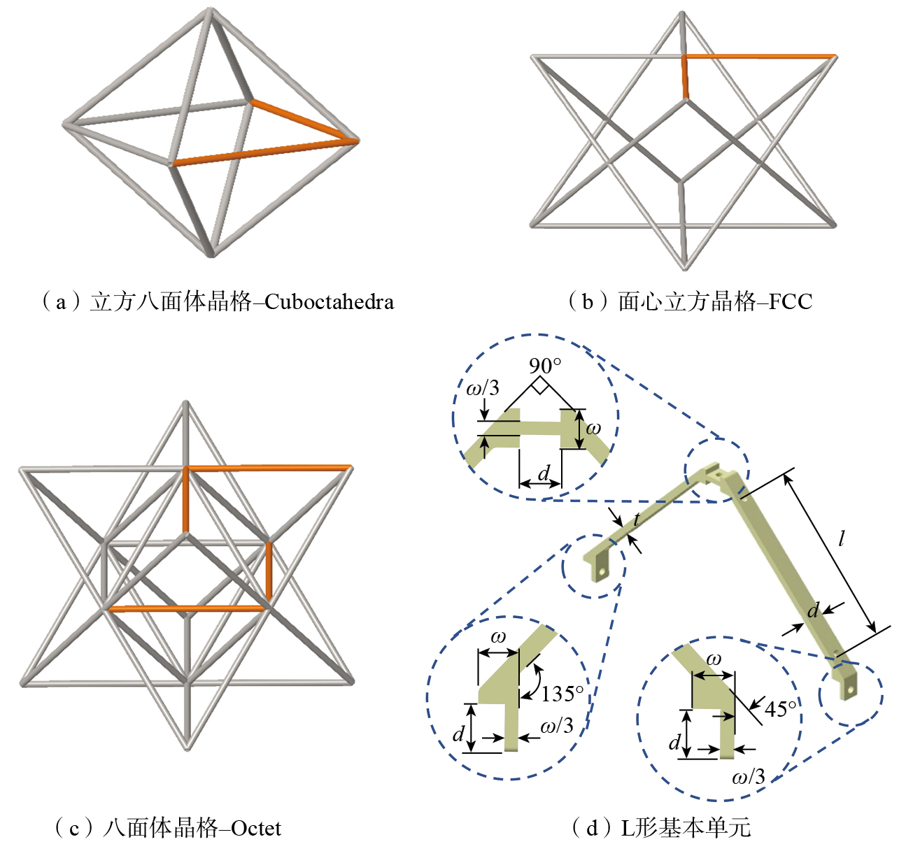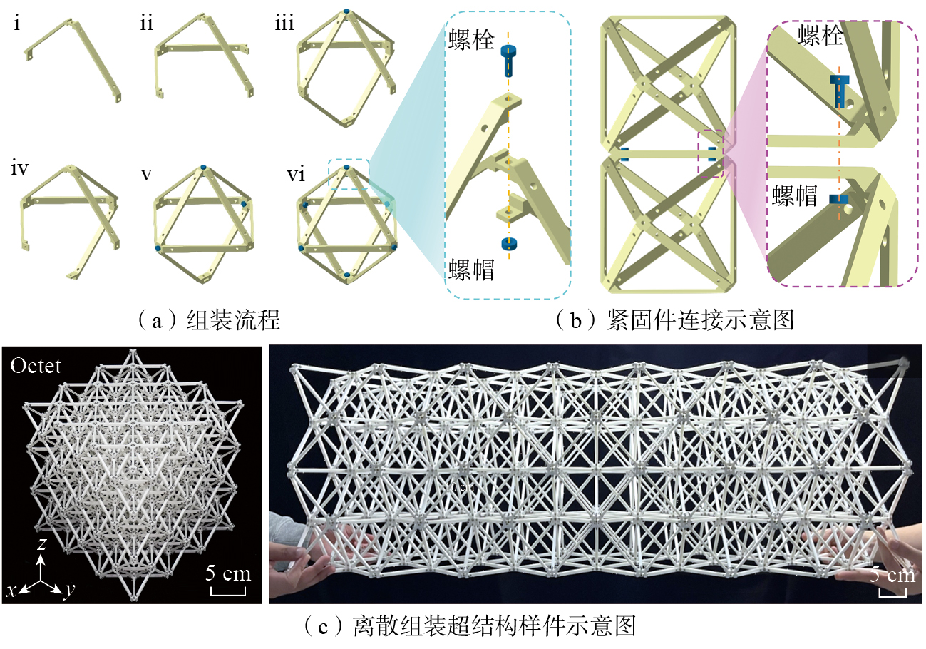 为突破上述制造瓶颈,离散组装超结构的概念应运而生[ CHEUNG K C, GERSHENFELD N. Reversibly assembled cellular composite materials[J]. Science, 2013, 341(6151): 1219–1221. 17]。该方法通过将复杂超结构分解为若干可重复制造、可互换、可装配的标准化构件,再通过机械连接[ GREGG C E, CATANOSO D, FORMOSO O I B, et al. Ultralight, strong, and self-reprogrammable mechanical metamaterials[J]. Science Robotics, 2024, 9(86): eadi2746. 18]、嵌锁[ DONG L. Mechanical responses of Ti–6Al–4V truss lattices having a combined simple-cubic and body-centered-cubic (SC–BCC) topology[J]. Aerospace Science and Technology, 2021, 116: 106852. 19]或磁性吸附[ JENETT B, ABDEL-RAHMAN A, CHEUNG K, et al. Material-robot system for assembly of discrete cellular structures[J]. IEEE Robotics and Automation Letters, 2019, 4(4): 4019–4026. 20]等方式实现模块化装配,从而在保持几何复杂性的同时实现可维护性与可重构性。与传统增材制造一体成型的超结构相比,离散组装结构不仅可在损伤后快速更换局部部件,还能通过单元重组实现不同拓扑结构间的快速切换,显著提升了结构体系的可扩展性与可编程性[ JENETT B, CAMERON C, TOURLOMOUSIS F, et al. Discretely assembled mechanical metamaterials[J]. Science Advances, 2020, 6(47): eabc9943. 21]。尽管如此,现有离散组装体系仍面临若干关键问题。其一,当前设计多基于特定拓扑结构的专用构件,仅适用于特定晶格(如八面体或蜂窝结构),缺乏多晶格间的几何兼容性与通用连接标准[ GREGG C E, KIM J H, CHEUNG K C. Ultra-light and scalable composite lattice materials[J]. Advanced Engineering Materials, 2018, 20(9): 1800213. LI J X, SUI C, SANG Y N, et al. A flexible, reusable and adjustable high-performance energy absorption system inspired by interlocking suture structures[J]. International Journal of Solids and Structures, 2024, 296: 112839. 22-23]。其二,性能调控维度有限,现有离散组装超结构大多数通过改变组件的几何尺寸来调控结构的力学特性,调控空间有限,难以实现刚度、强度、吸能等多性能的协同优化。这些问题使得离散组装超结构的设计灵活性与工程适用性大打折扣。