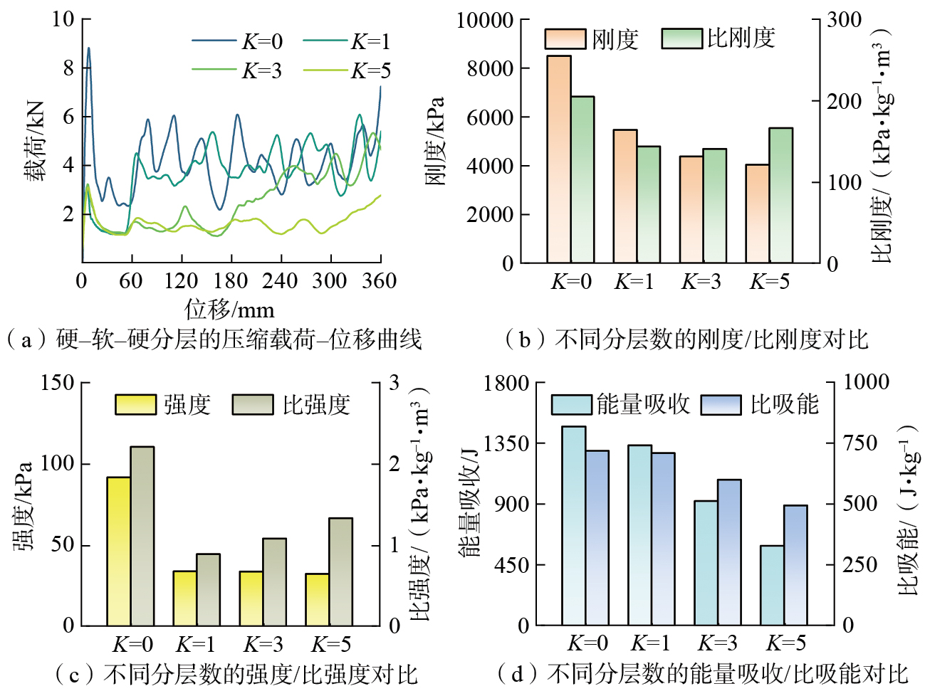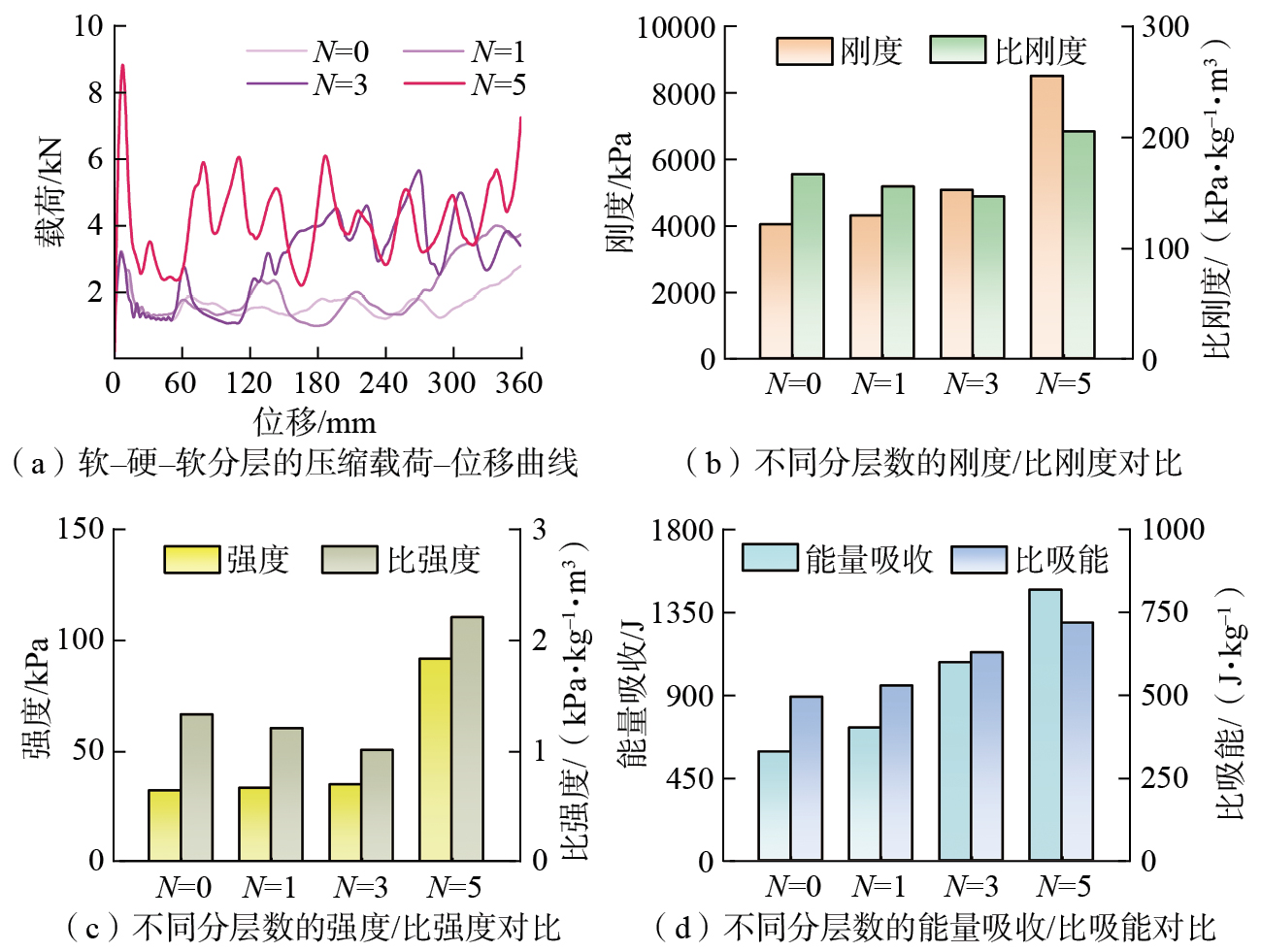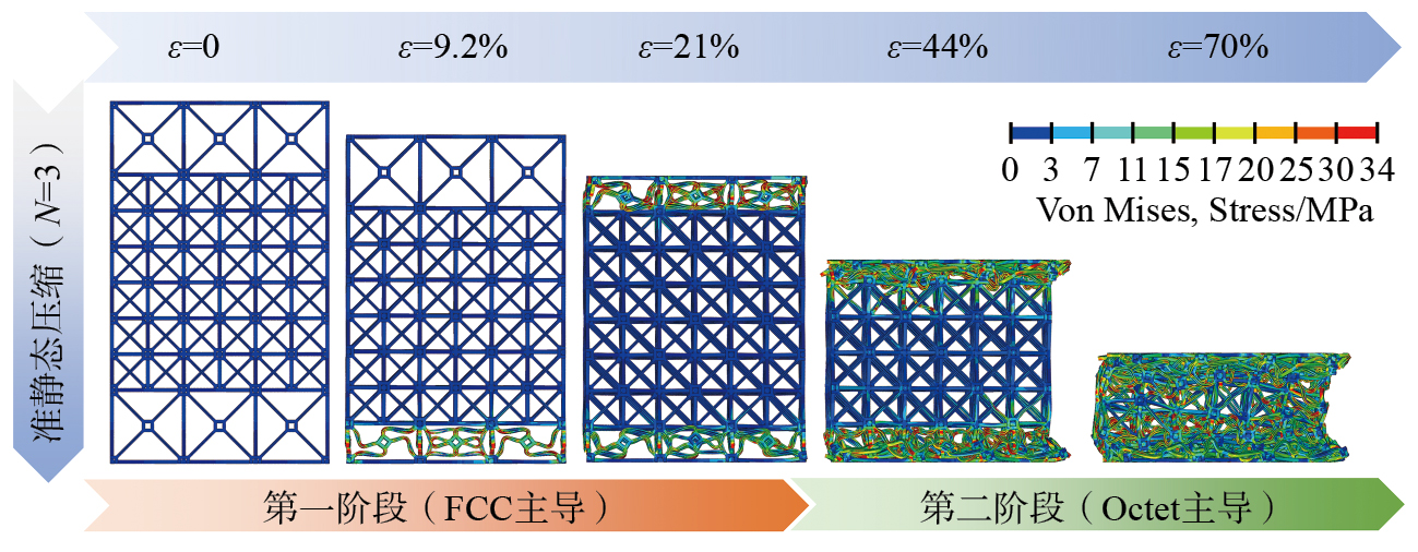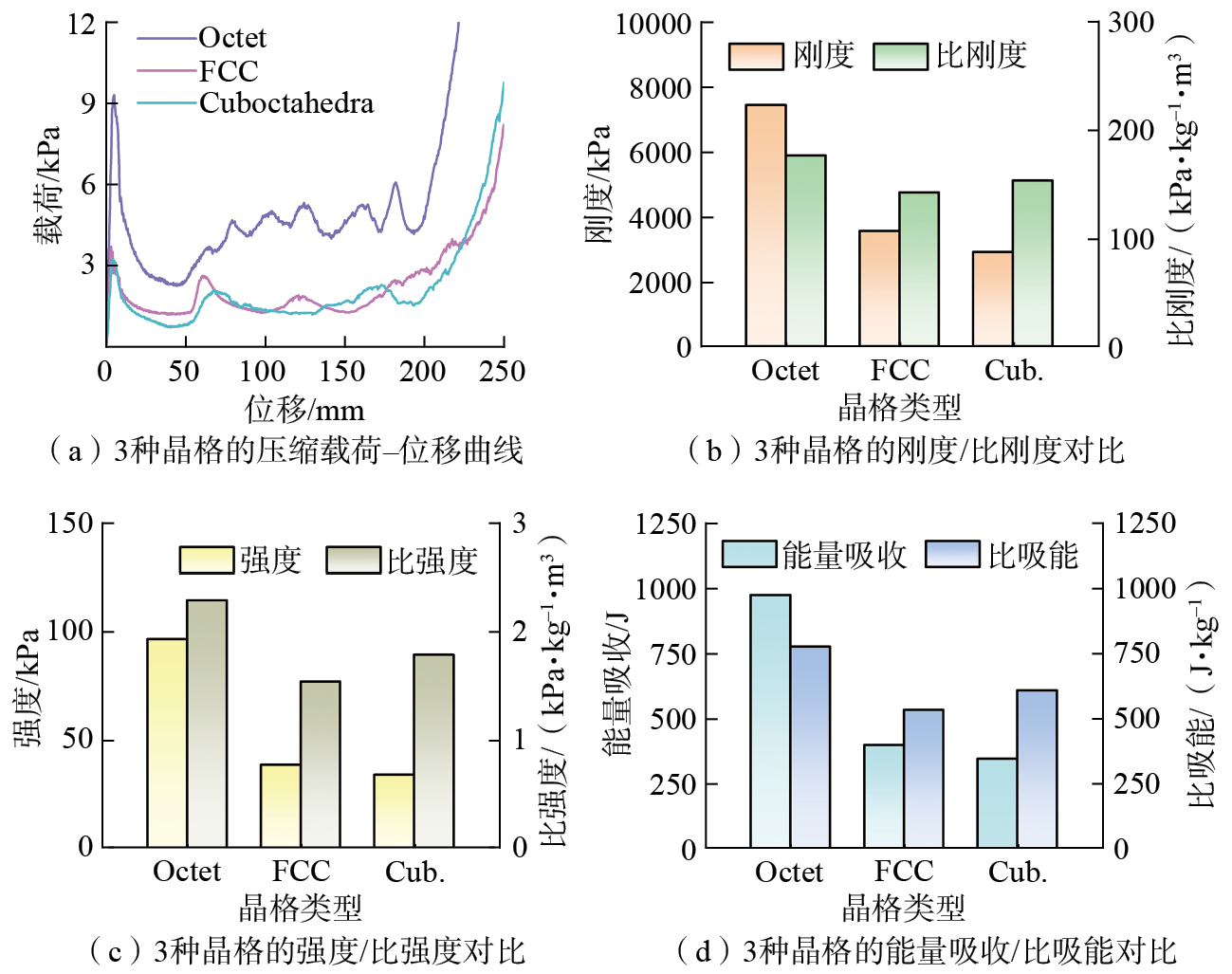 图10(b)定量的比较了3种晶格的刚度与比刚度特性。Octet晶格的刚度最高,可以达到7444 kPa,比刚度为176 kPa·kg–1·m3。这主要归因于Octet晶格节点连通性较高,受力以拉伸为主导,故而单位质量承载效率最优[ DONG L, DESHPANDE V, WADLEY H. Mechanical response of Ti–6Al–4V octet-truss lattice structures[J]. International Journal of Solids and Structures, 2015, 60–61: 107–124. 24]。FCC晶格的刚度和比刚度分别为3565 kPa和142 kPa·kg–1·m3;Cuboctahedra晶格的刚度最低,仅为2917 kPa。3种晶格的强度与比强度特性如图10(c)所示,Octet晶格峰值强度最高,达到96 kPa,比强度为2.3 kPa·kg–1·m3,承载能力优异;FCC与Cuboctahedra晶格的强度相对较低。其中,FCC晶格的强度为38 kPa,相比于octet晶格下降了60.4%,其峰值应力降低且应力平台稳定,在冲击防护领域极具应用潜力。图10(d)对3种晶格的能量吸收特性进行了比较,为便于吸能能力对比,此处能量吸收取应变达0.7前对应阶段的能量。Octet晶格总能量吸收量最高达到974 J,比吸能达到775 J·kg–1,展现出高载荷下的强吸能特性。FCC晶格与Cuboctahedra晶格吸能能力稍低,但能量吸收曲线平缓,吸能稳定,可在大应变范围内持续耗能,适用于缓冲吸能及减震场景。综合对比可知,3种晶格在力学性能上呈现出明显差异:Octet晶格刚度与强度最高,单位质量承载效率优异,适用于高载荷承载与支撑结构;FCC晶格与Cuboctahedra晶格刚度与能量吸收性能均衡,结构稳定性好,吸能稳定,能在较大应变下持续耗能,适合缓冲吸能及减震应用。为后续混杂结构力学性能的可编程特性提供了理论依据与数据支持。