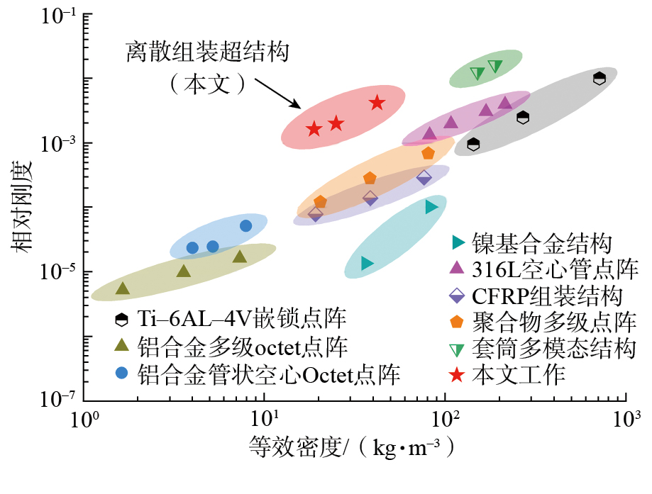 图11 不同结构的相对刚度–等效密度关系图[ DONG L. Mechanical responses of Ti–6Al–4V truss lattices having a combined simple-cubic and body-centered-cubic (SC–BCC) topology[J]. Aerospace Science and Technology, 2021, 116: 106852. 19, ZHANG J W, ZHAO T H, YI Y S, et al. Additive manufacturing assisted fabrication of octet truss structures using continuous carbon fibre composites and the resulting mechanical responses[J]. Journal of Materials Processing Technology, 2023, 319: 118089. GUO X Y, XU Y M, WANG X, et al. Hierarchical discrete assembly of mechanical metamaterials with application to modular unmanned aerial systems[J/OL]. Advanced Materials Technologies, 2025: e01455[2025-09-10]. https://advanced.onlinelibrary.wiley.com/doi/abs/10.1002/admt.202501455. 25-26]