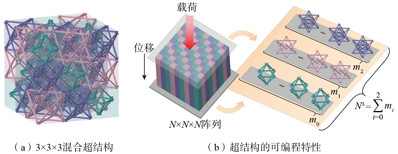 力学超结构作为一种通过人工设计拓扑结构实现非常规力学性能的先进材料体系,已成为解决航空航天、智能装备、防护工程等领域“轻量化–高承载–多功能”矛盾的核心技术之一[ LI Y B, YU S Y, QING H T, et al. Reprogrammable and reconfigurable mechanical computing metastructures with stable and high-density memory[J]. Science Advances, 2024, 10(26): eado6476. 王国庆, 王鹏飞, 李振, 等. 超结构制造: 开辟先进制造新领域[J]. 机械工程学报, 2025, 61(16): 1–12.WANG Guoqing, WANG Pengfei, LI Zhen, et al. Meta-structure manufacturing: Pioneering new frontiers in advanced manufacturing[J]. Journal of Mechanical Engineering, 2025, 61(16): 1–12. 姚谦, 杨钊, 王昕, 等. 力学超结构设计方法研究进展[J]. 应用数学和力学, 2024, 45(8): 974–1000.YAO Qian, YANG Zhao, WANG Xin, et al. A review of design methods for mechanical metastructures[J]. Applied Mathematics and Mechanics, 2024, 45(8): 974–1000. 1-3]。通过精准调控结构单元的几何特征,可实现传统天然材料难以企及的性能,如超高刚度[ ZHENG X Y, LEE H, WEISGRABER T H, et al. Ultralight, ultrastiff mechanical metamaterials[J]. Science, 2014, 344(6190): 1373–1377. 4]、负泊松比[ ZHANG X Y, SUN Q, LIANG X, et al. Stretchable and negative-poisson-ratio porous metamaterials[J]. Nature Communications, 2024, 15: 392. 5]、负热膨胀[ HE P, DU T, ZHAO K R, et al. Lightweight 3D graphene metamaterials with tunable negative thermal expansion[J]. Advanced Materials, 2023, 35(6): 2208562. 6]等,在航天器轻量化构件、高速装备缓冲系统、极端环境防护装置等场景中展现出广阔应用前景。随着工程需求向动态适配和多功能集成升级,对力学超结构的性能调控灵活性、结构可扩展性提出更高要求。亟须突破传统设计范式,构建兼具模块化、可重构与可编程特性的新型超结构体系[ JIAO P C, MUELLER J, RANEY J R, et al. Mechanical metamaterials and beyond[J]. Nature Communications, 2023, 14: 6004. 7]。