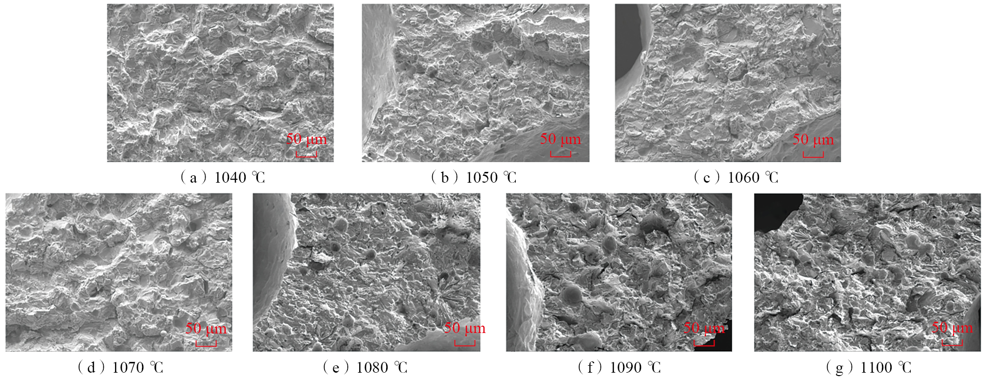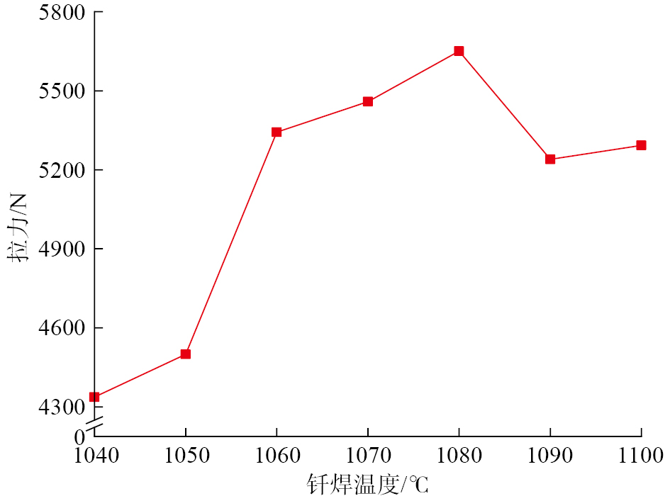 对不同钎焊温度下试样的拉伸强度进行检测,如图4所示。可以看出,随着钎焊温度的升高,钎焊接头拉伸强度呈现出先升高后下降的趋势,这与接头处拉伸强度随钎焊温度变化的趋势一致[ 付强. GH3030蜂窝密封产品钎焊工艺及性能研究[D]. 哈尔滨: 哈尔滨工业大学, 2016.FU Qiang. Research on brazing process and properties of gh3030 cellular honeycomb seal products[D]. Harbin: Harbin Institute of Technology, 2016. 邱富成. 快速热处理优化TC18钛合金组织与力学性能的机理研究[D]. 长春: 吉林大学, 2024.QIU Fucheng. Mechanistic study on optimizing microstructure and mechanical properties of TC18 titanium alloy via rapid heat treatment[D]. Changchun: Jilin University, 2024. 黄麟. 镍基高温合金蜂窝结构钎焊工艺及熔蚀行为研究[D]. 哈尔滨: 哈尔滨工业大学, 2008.HUANG Lin. Nickel based honeycomb structure brazing technology and erosion behavior research[D]. Harbin: Harbin Institute of Technology, 2008. 7-9]。当钎焊温度为1080 ℃时,试样具有最大抗拉伸强度。这是因为随着温度的升高,熔化的钎料与气体的界面张力以及钎料与母材的界面张力均下降,有助于提高钎料的润湿性。而通常温度越高,钎料润湿效果越好,铺展面积也越大。但是,如果钎焊温度过高,就可能导致母材晶粒长大,造成钎料的过度流失且不易填满钎缝,从而导致钎缝性能下降。因此会存在一个最佳钎焊温度使接头强度值最大。